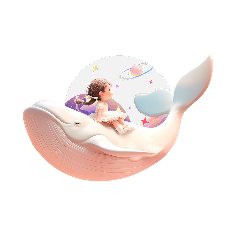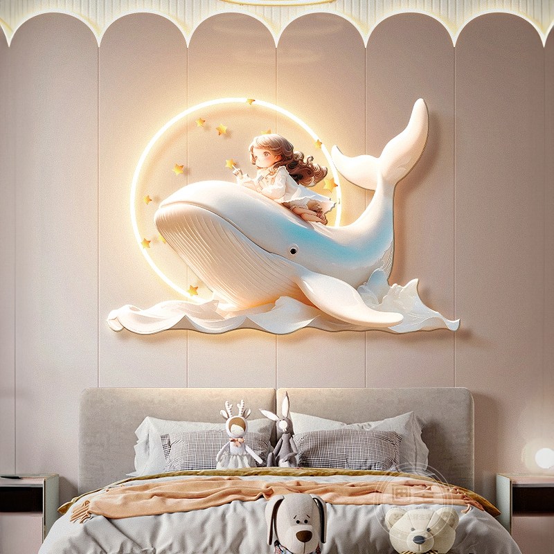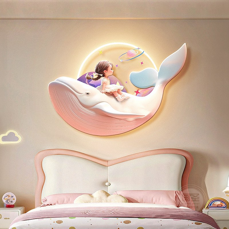 📚 奶油风公主儿童房装饰画鲸鱼卧室床头挂画带灯光卡通客厅壁饰画