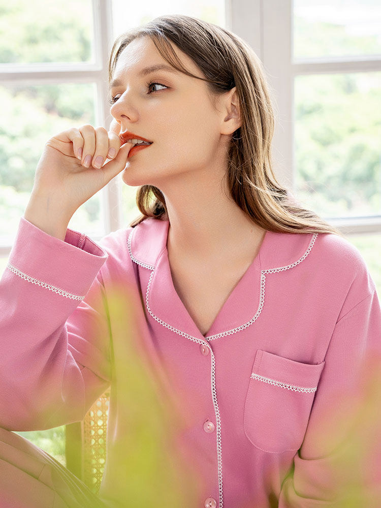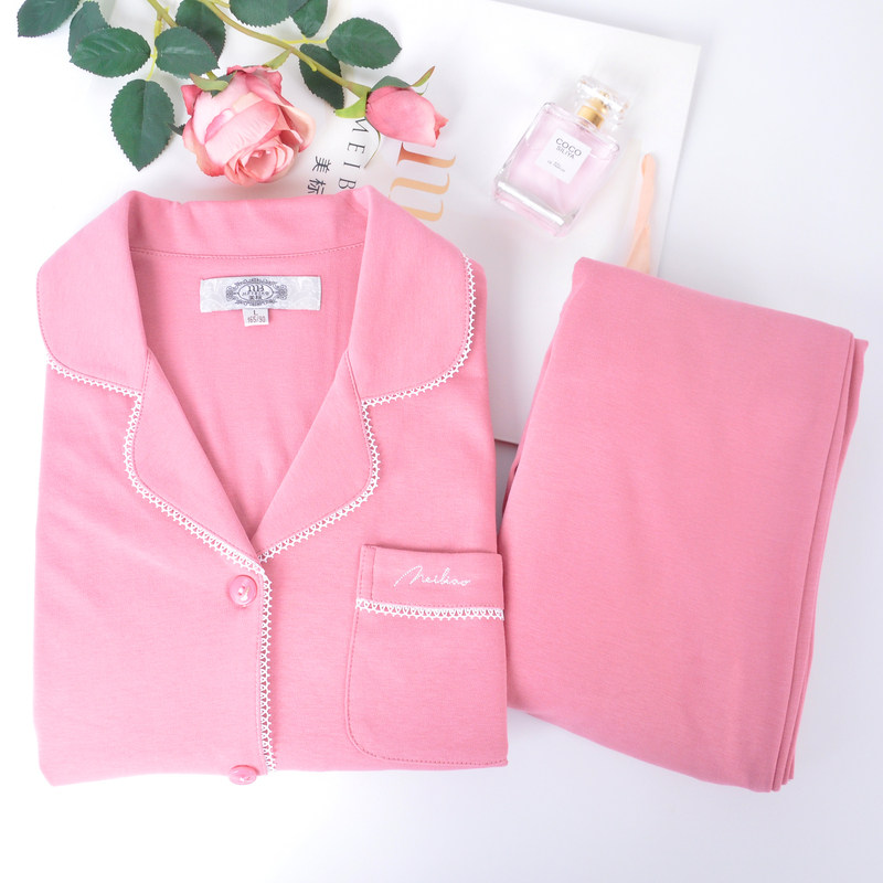 📚 美标秋冬季长袖针织纯棉睡衣套装女开衫全棉休闲家居服芭比粉
