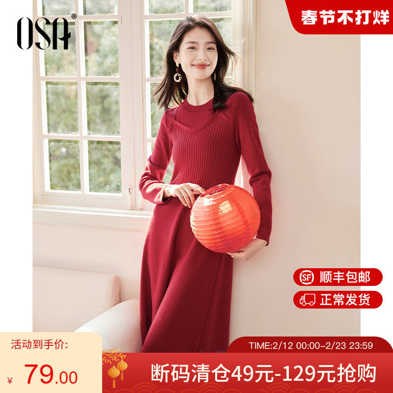 📚 OSA欧莎新年红假两件连衣裙女2025年新款冬季过膝中长款打底裙子