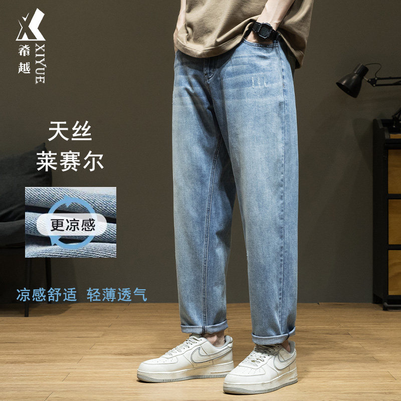 📚 夏季凉感天丝莱赛尔锥形九分牛仔裤男宽松大码休闲直筒显瘦长裤子