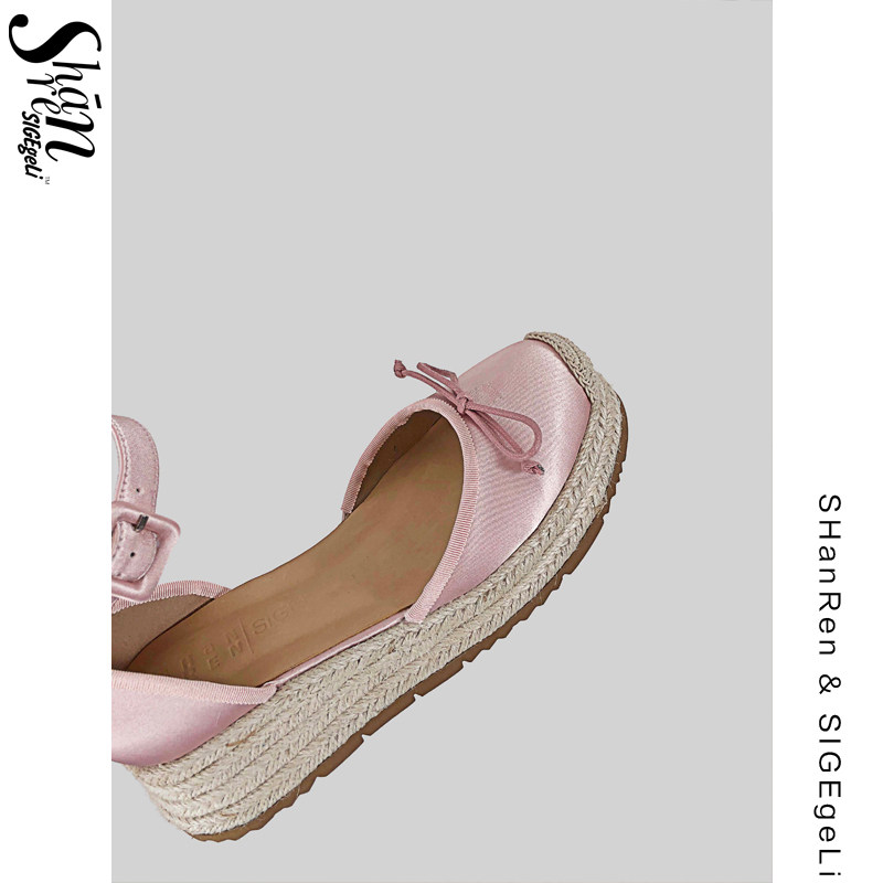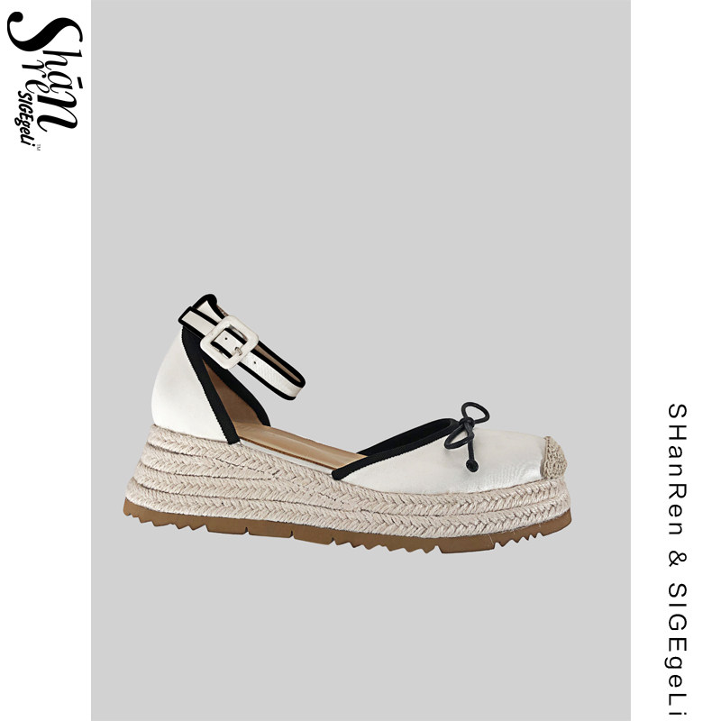 📚 SHANREN 蝴蝶结高跟玛丽珍鞋休闲草编厚底松糕鞋包头中空凉鞋女鞋