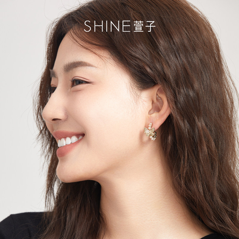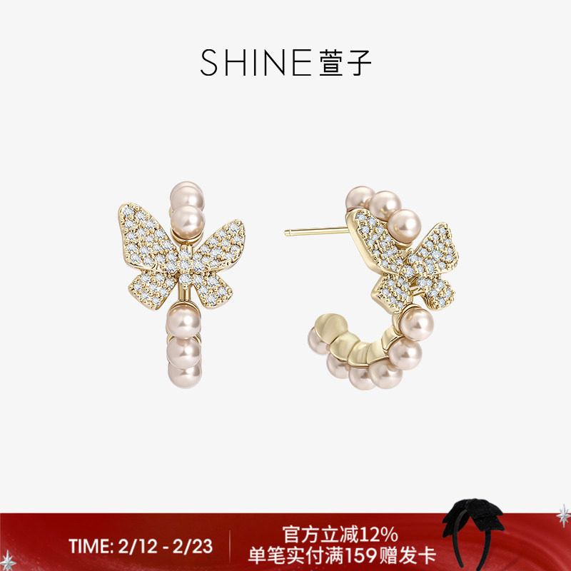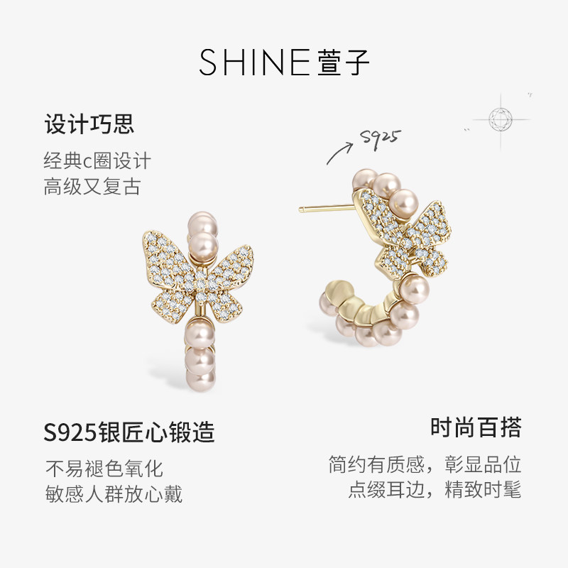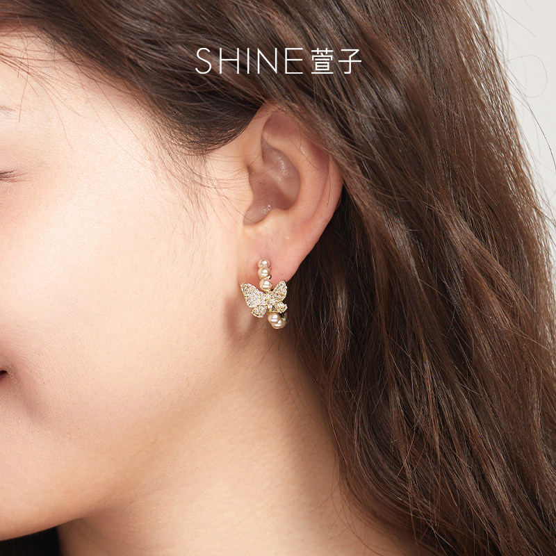 📚 SHINE萱子饰品优雅精致蝴蝶珍珠耳环精致璀璨C圈耳钉气质礼物送人