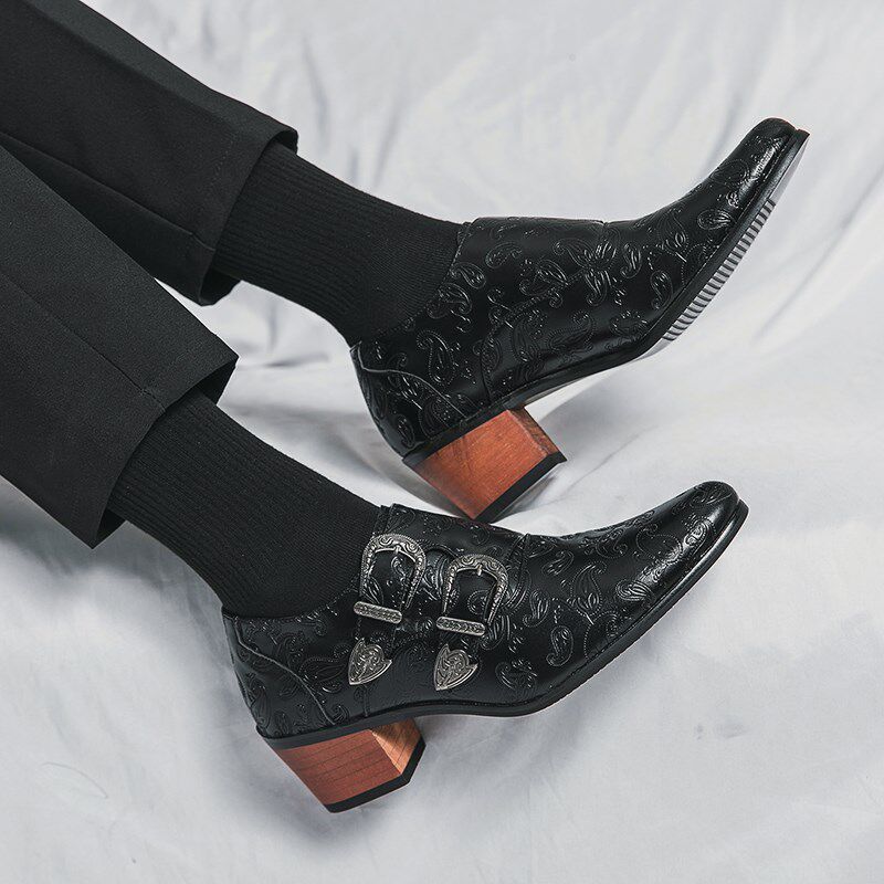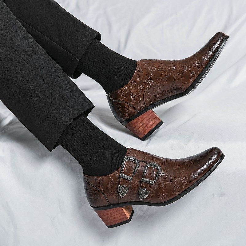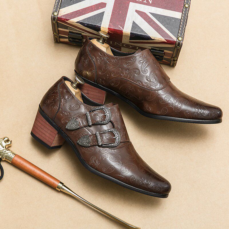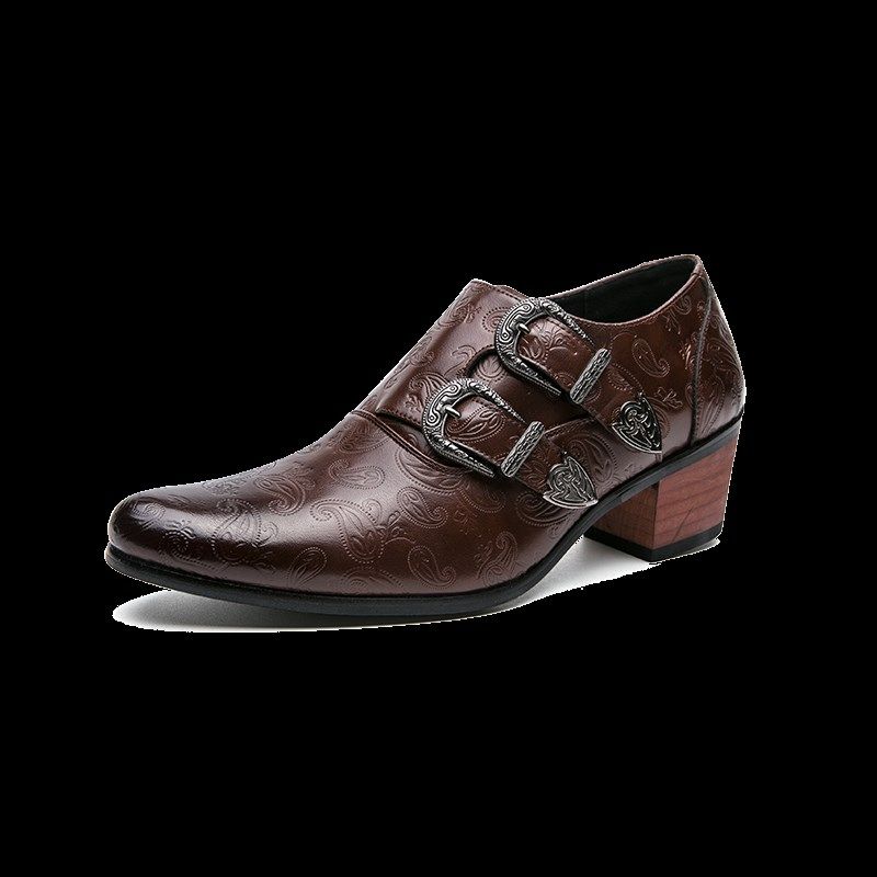 📚 新款韩版棕色男鞋结婚鞋时尚修身尖头高跟套脚鞋透气休闲潮流皮鞋