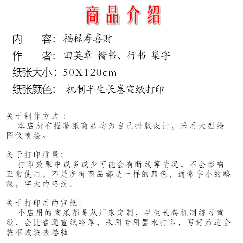 📚 福禄寿喜财田英章楷书行书描红描摹宣纸50X120CM长卷宣纸打印