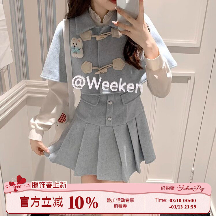 📚 织物猪 蓝白月光 千金感斗篷披肩连衣裙套装女秋冬小香风长袖短裙
