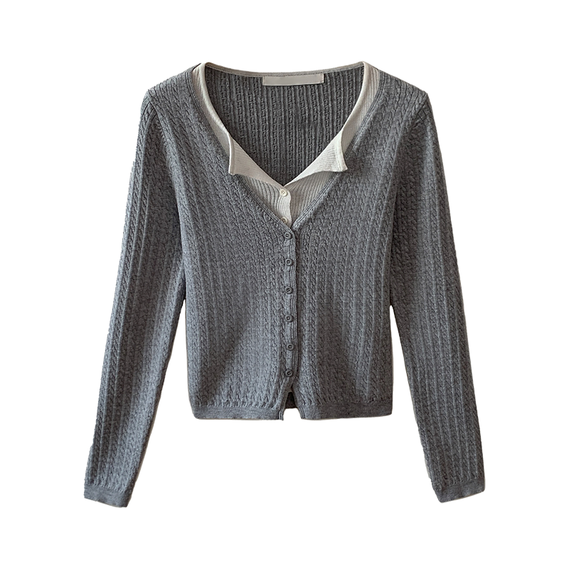 📚 龙妹家灰色V领假两件针织开衫女外穿毛衣2026春新款修身打底上衣