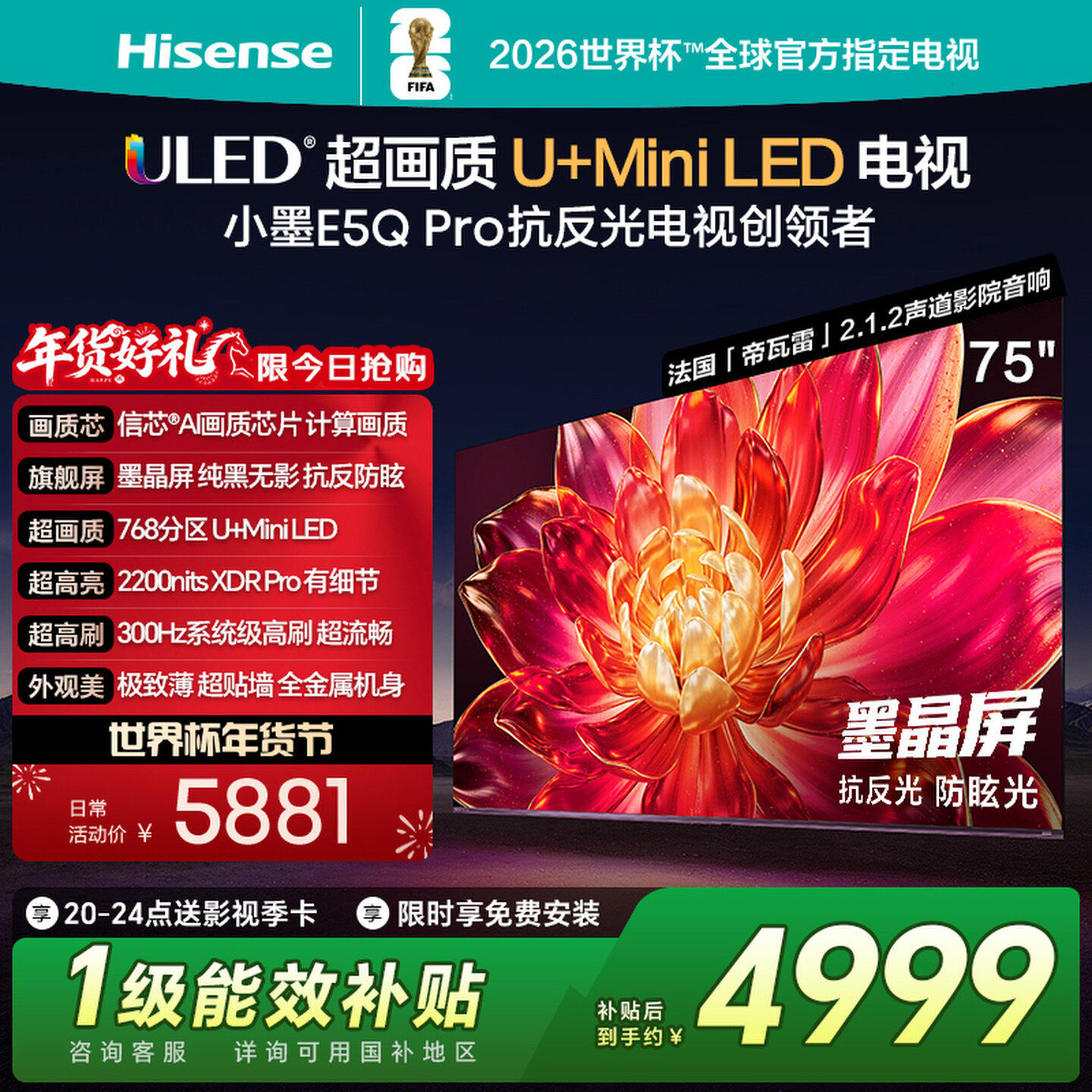📚 海信小墨E5Q Pro 75英寸 超画质U+MiniLED 墨晶屏 智能语音电视