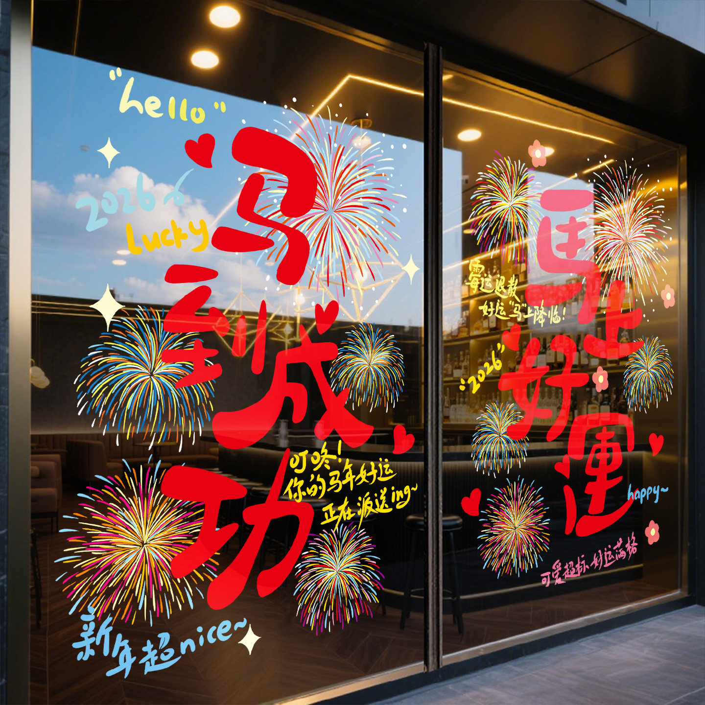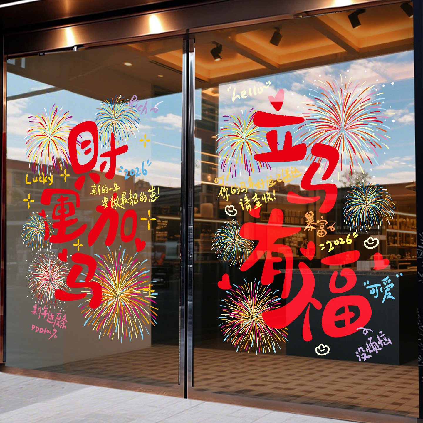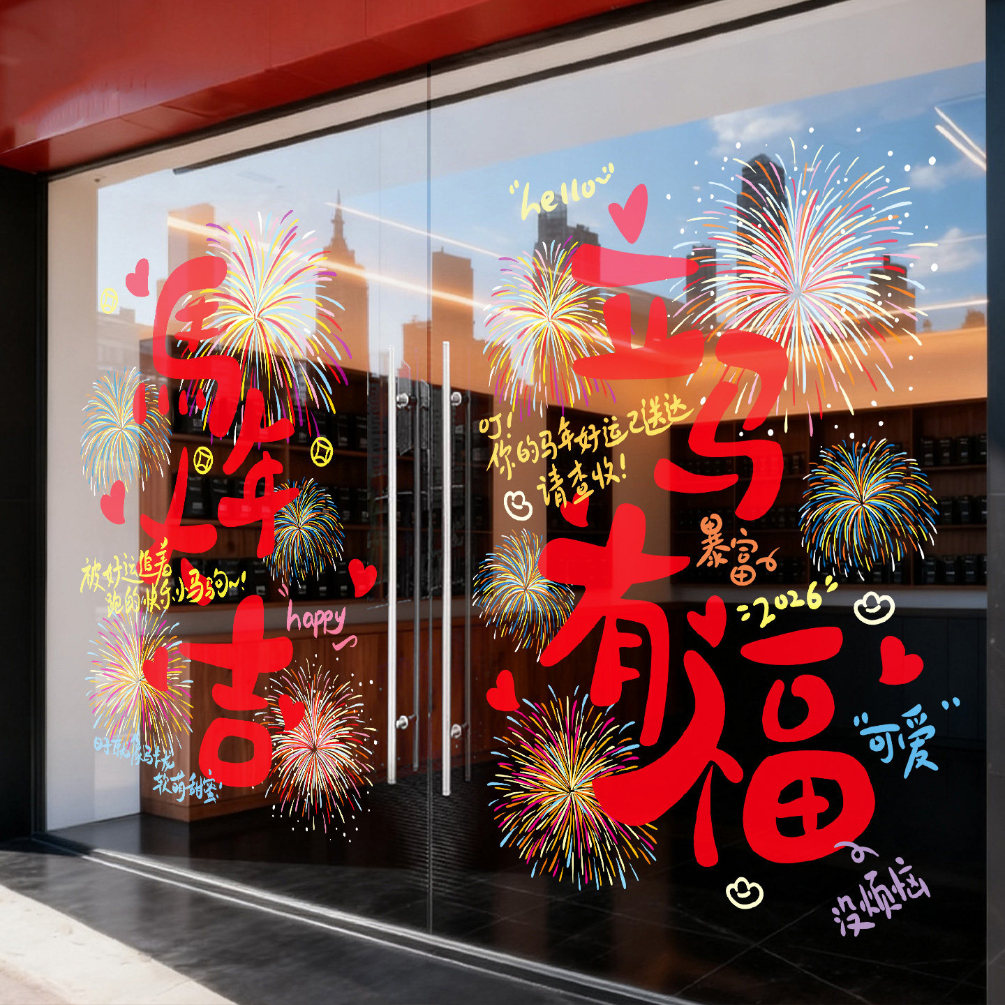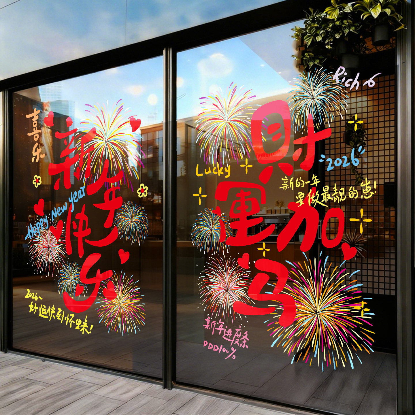 📚 新年快乐玻璃门贴纸烟花静电贴2026贺年装饰店铺海报马年对联窗花