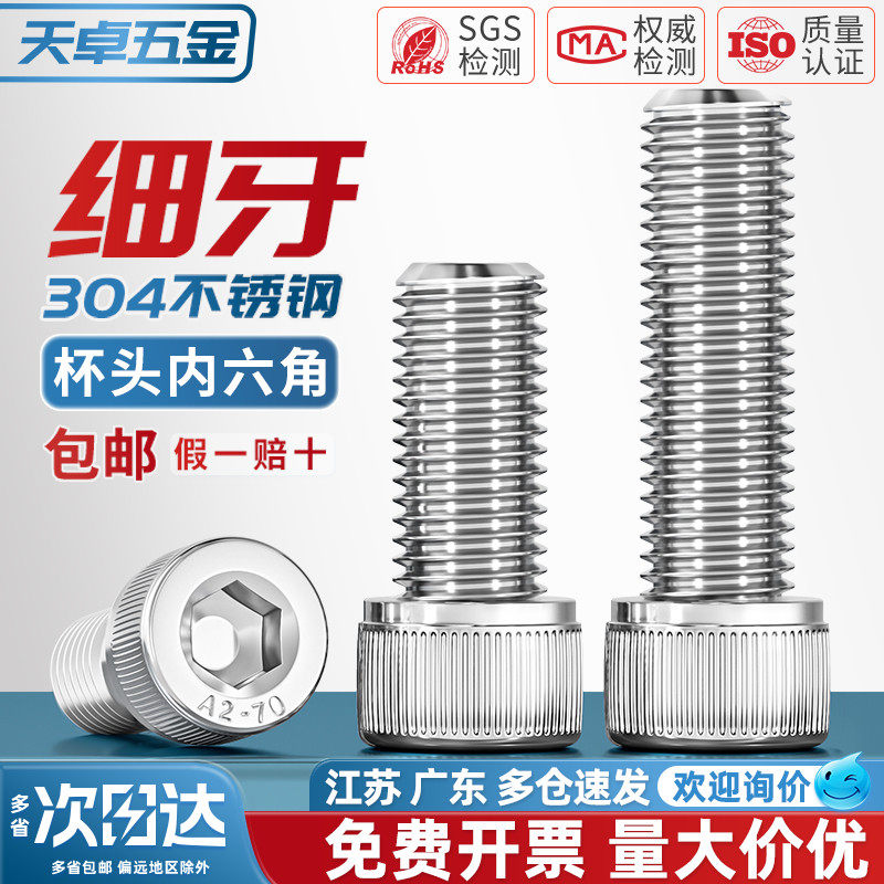 📚 细牙内六角螺丝304不锈钢幼牙圆柱头螺栓M6M8M10M12*1/1.25/1.5mm