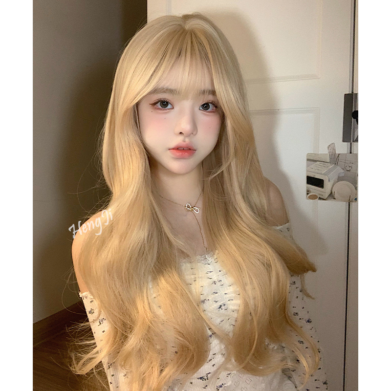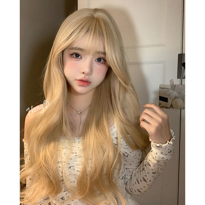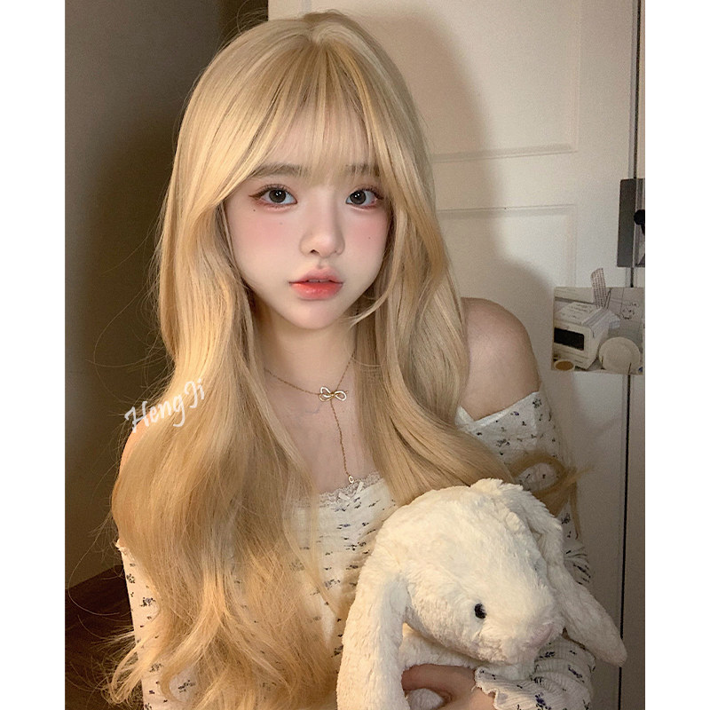 📚 哼唧假发女日常网红长卷发自然白金色齐刘海全头套式lolita假发套