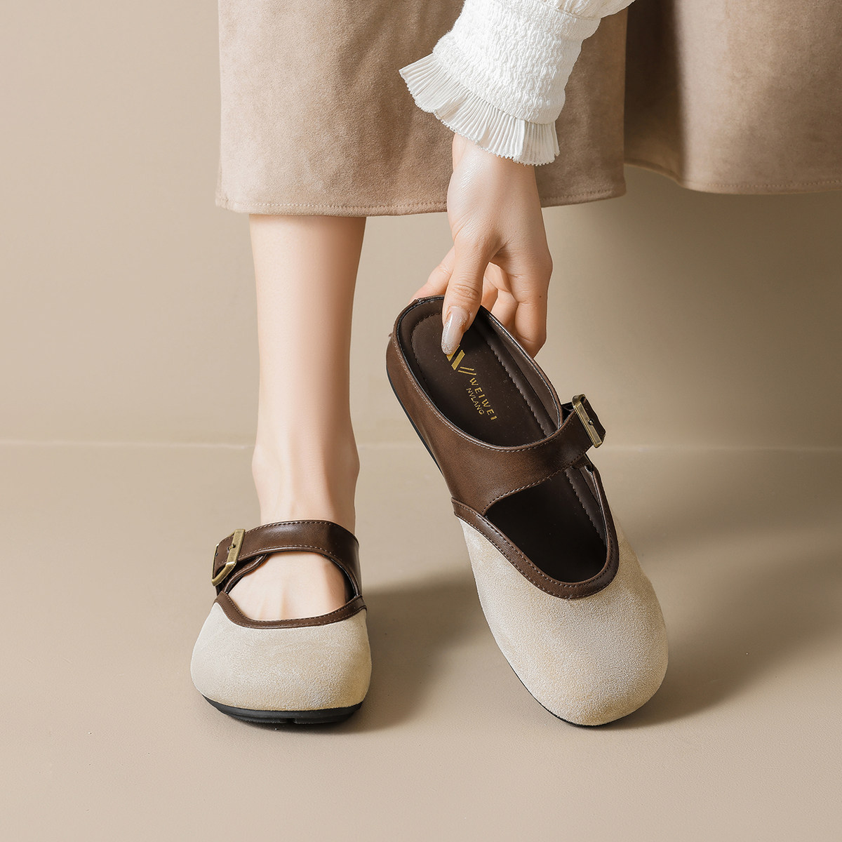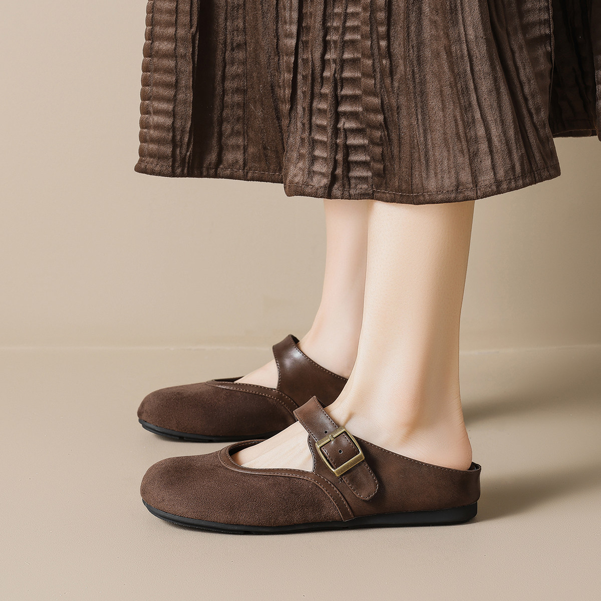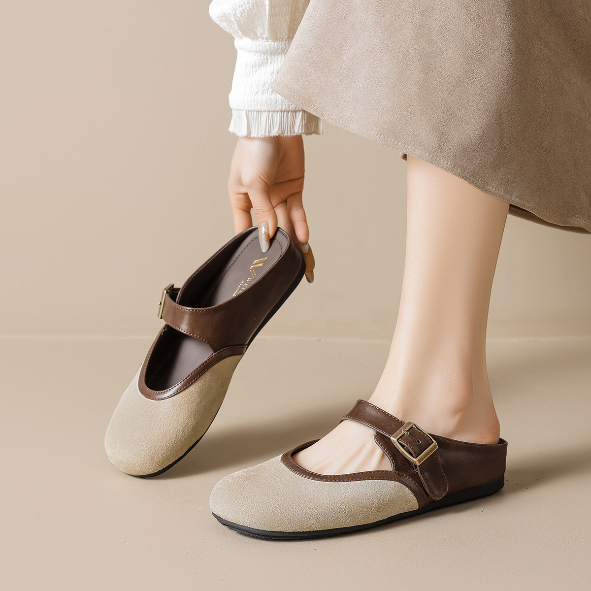 📚 法式复古拼色内增高勃肯鞋女外穿平底一脚蹬懒人鞋包头半拖凉鞋女