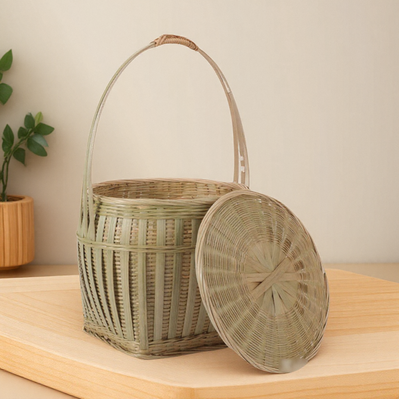 📚 竹编手提篮竹篮子带盖子圆形方底头层竹青编织 收纳鸡蛋篮竹筐