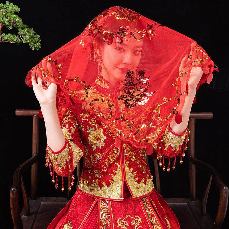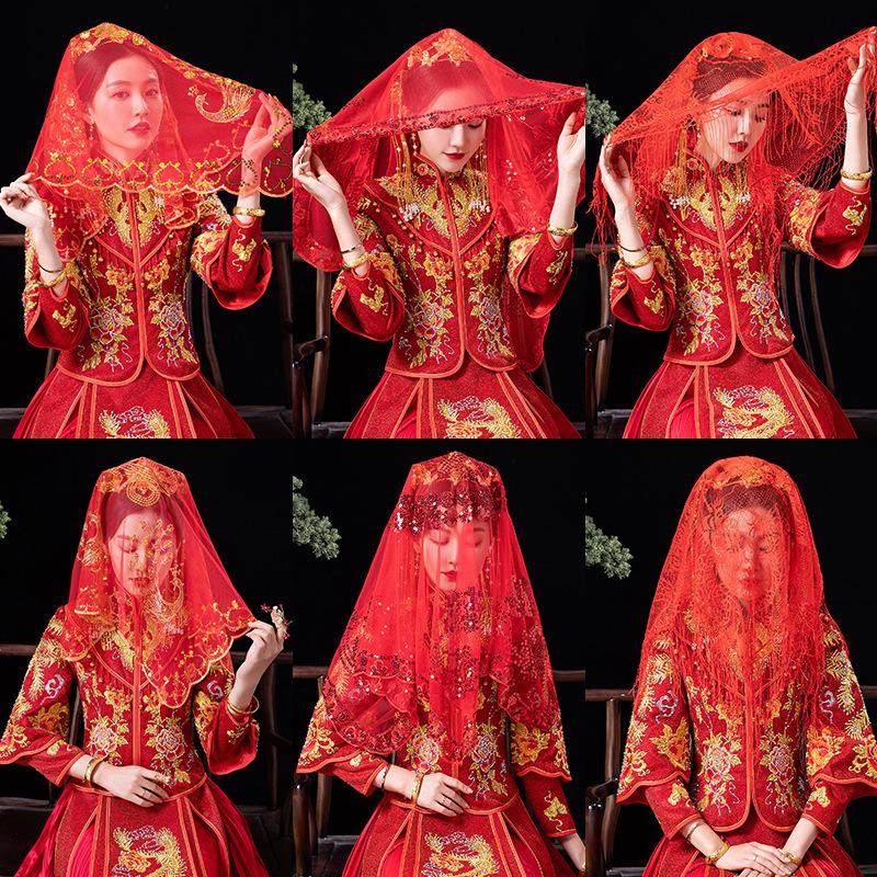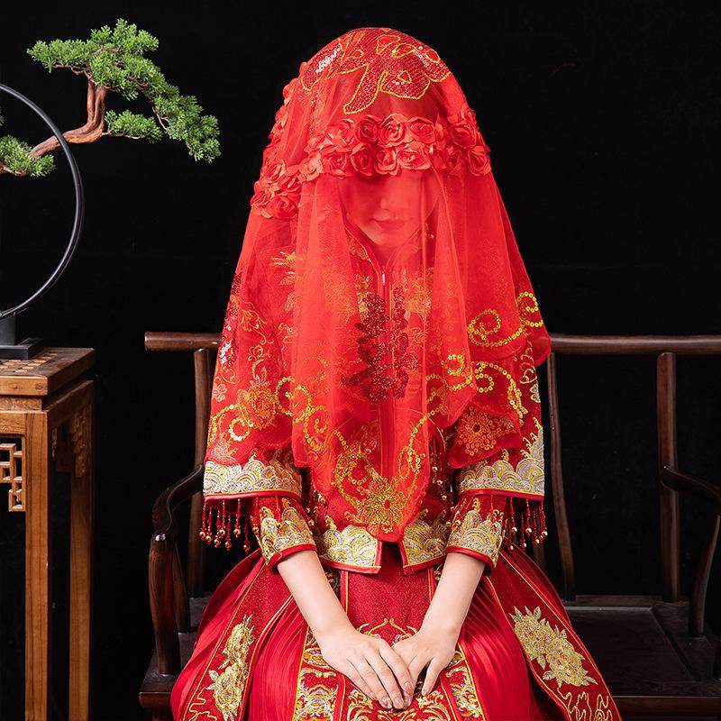 📚 新娘红盖头结婚苏绣半透明网纱头纱红色秀禾服喜帕中式婚礼蒙头巾