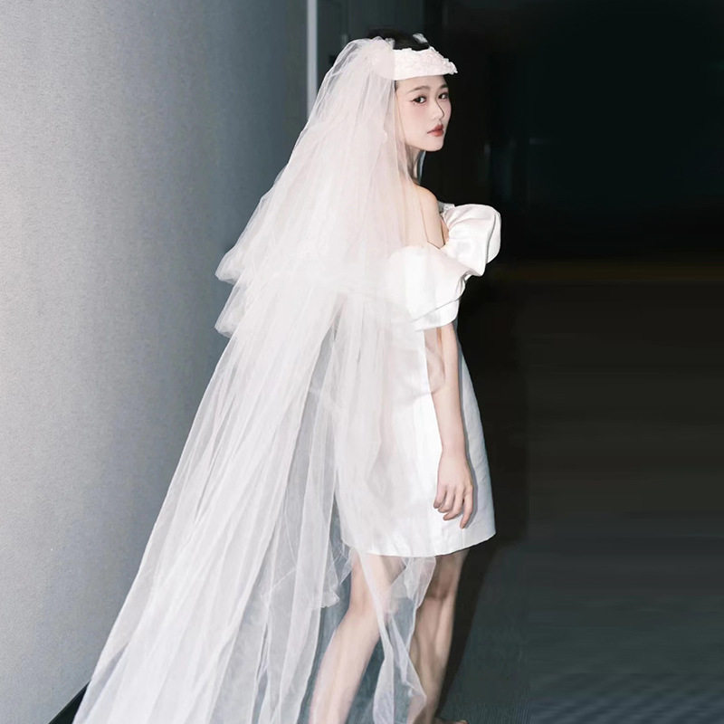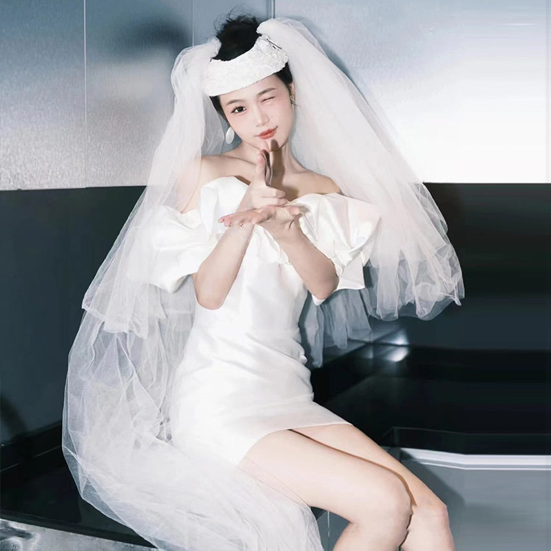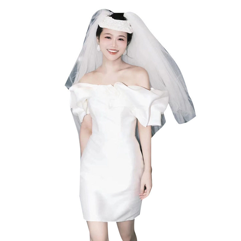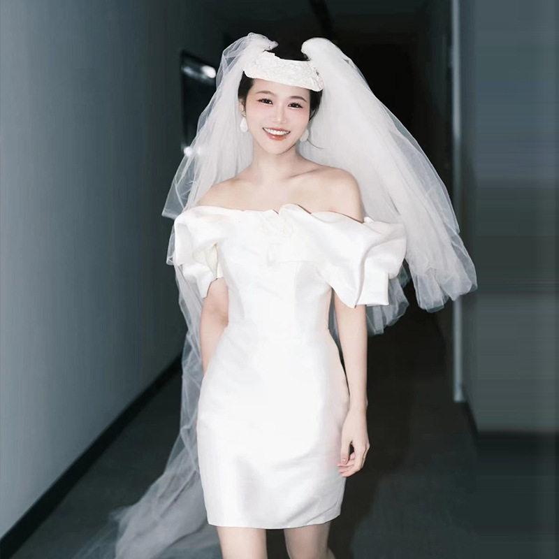 📚 法式轻婚纱新娘一字肩简约气质缎面出门纱短款领证订婚礼服小个子