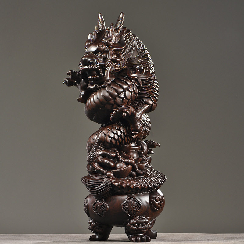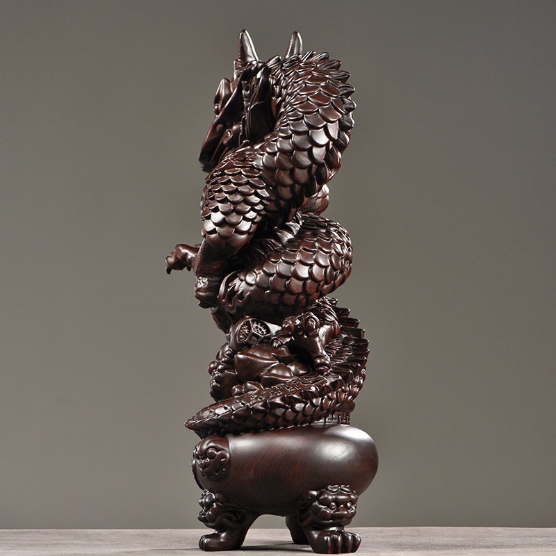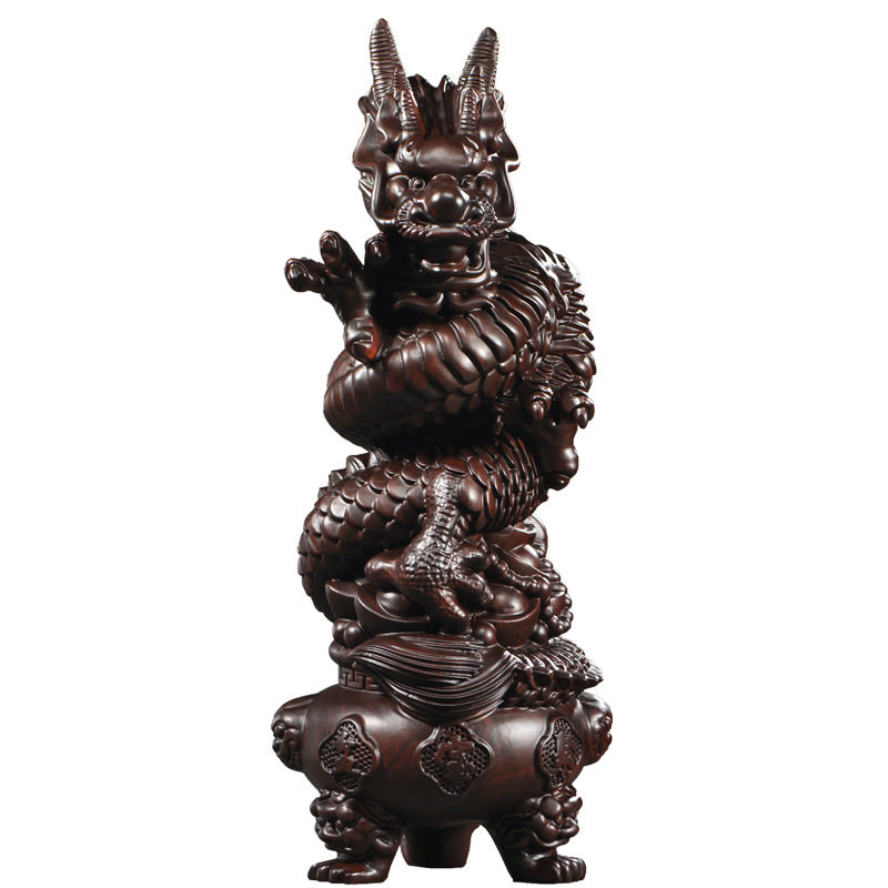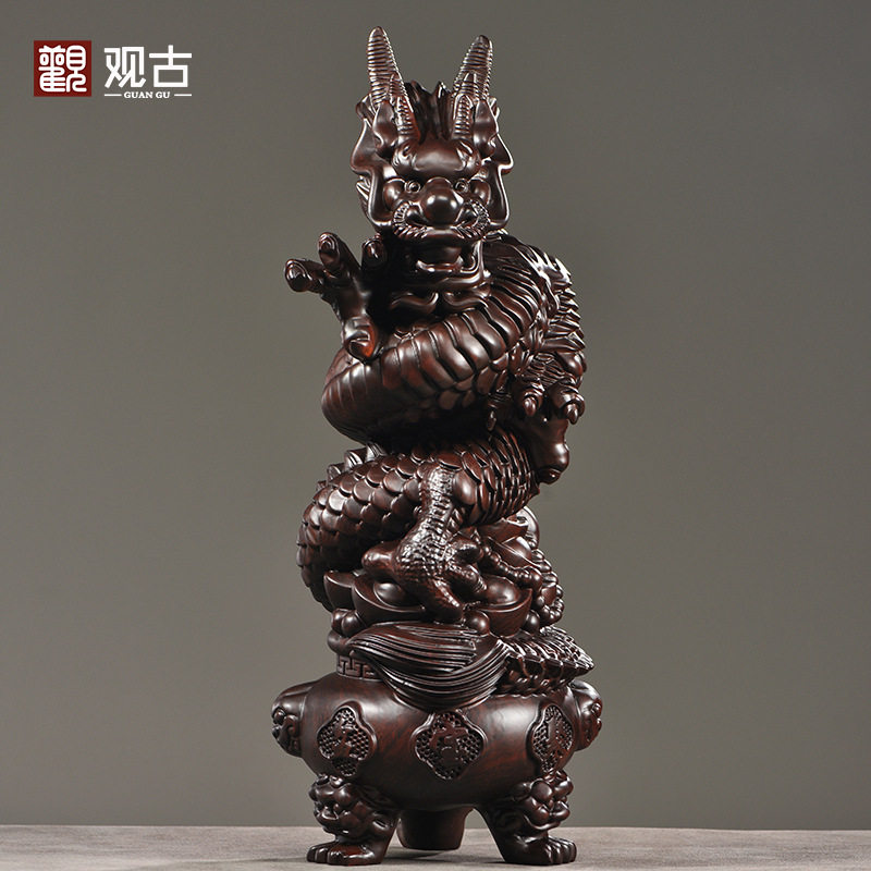 📚 黑檀木雕十二生肖龙摆件聚宝盆盘龙家居风水吉祥物补角装饰工艺品