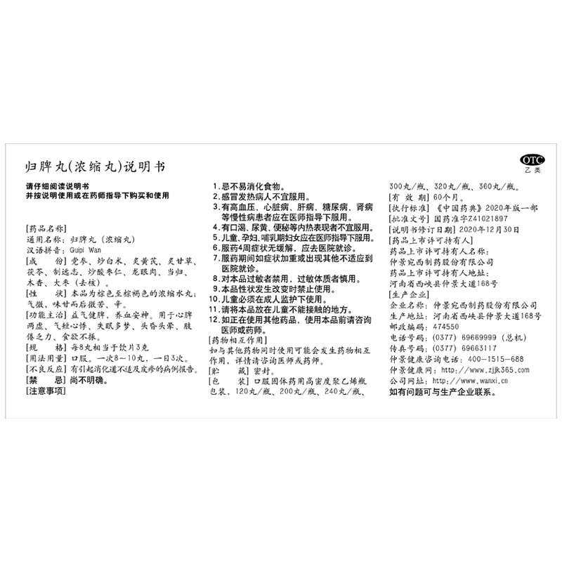 📚 仲景 归脾丸(浓缩丸) 200丸 心脾两虚 气短心悸 失眠