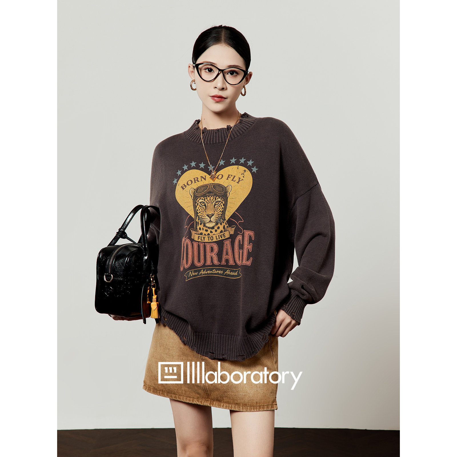 📚 周里物出品「豹子军官」烟灰色毛衣女2026春季新款复古风针织上衣