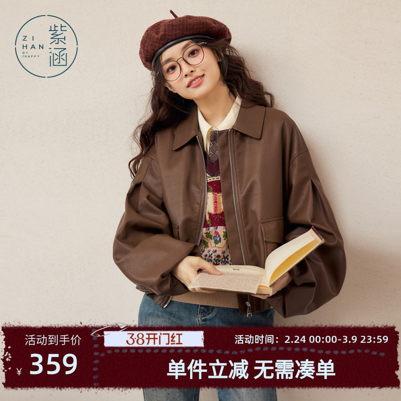 📚 紫涵短款宽松皮衣外套女春季新款美拉德通勤翻领复古PU皮夹克上衣