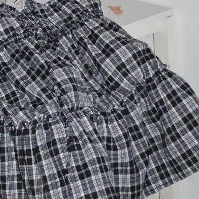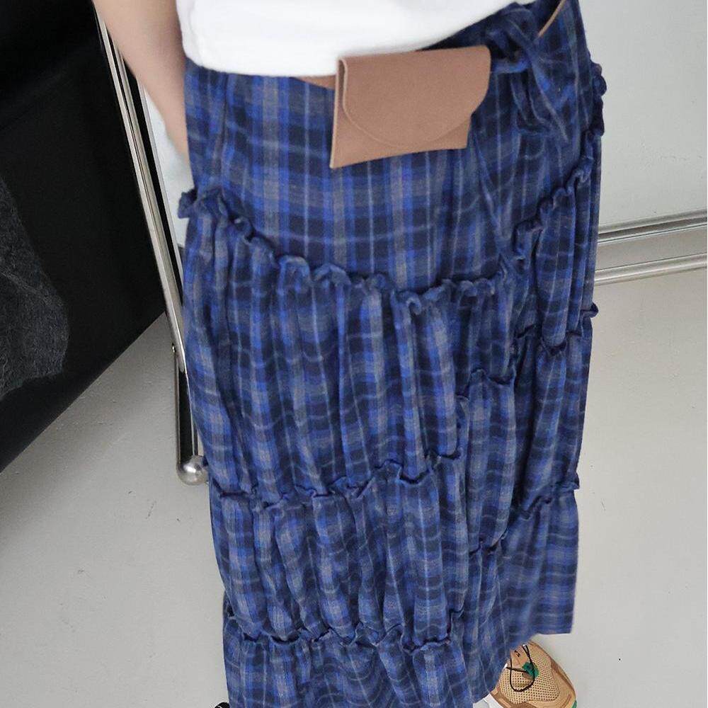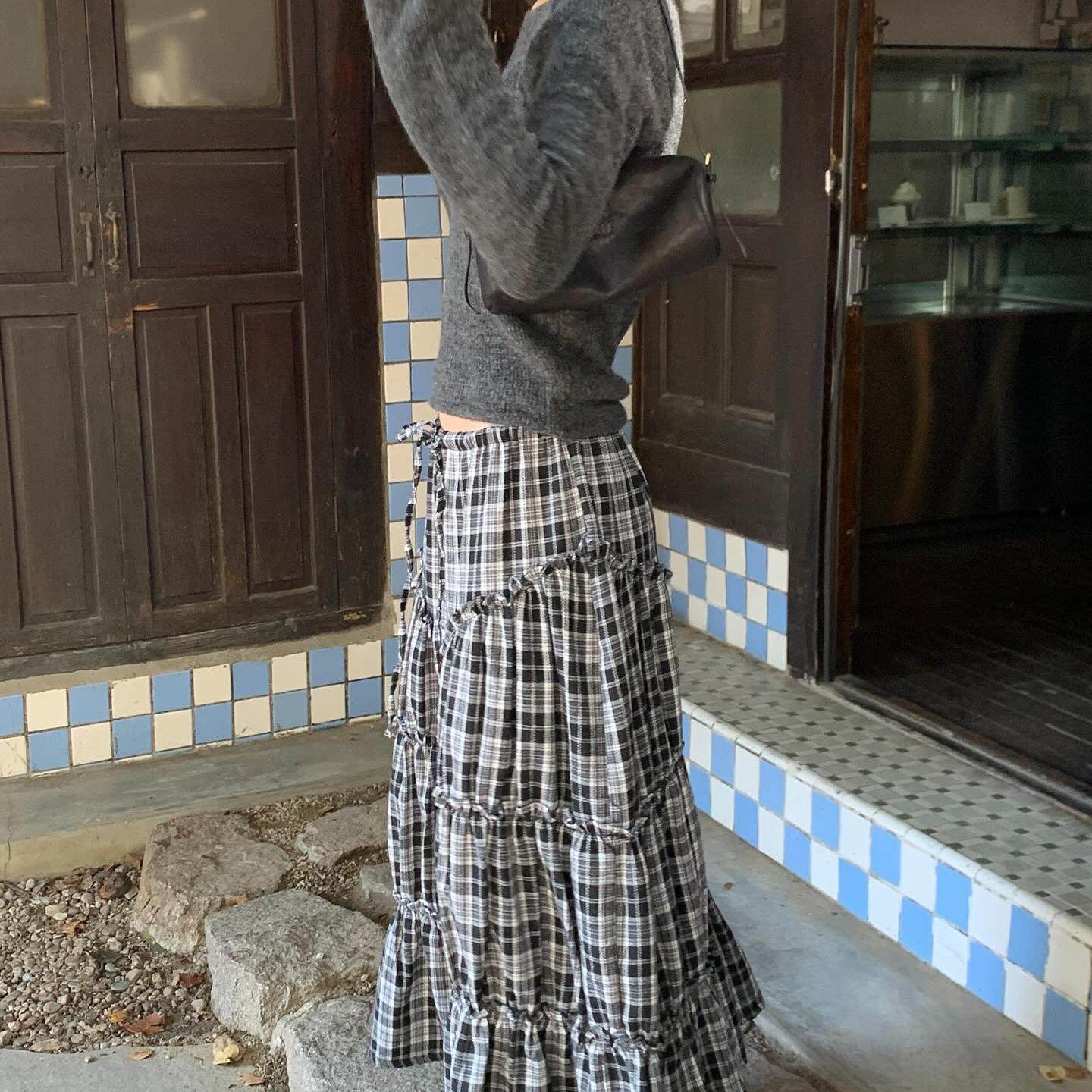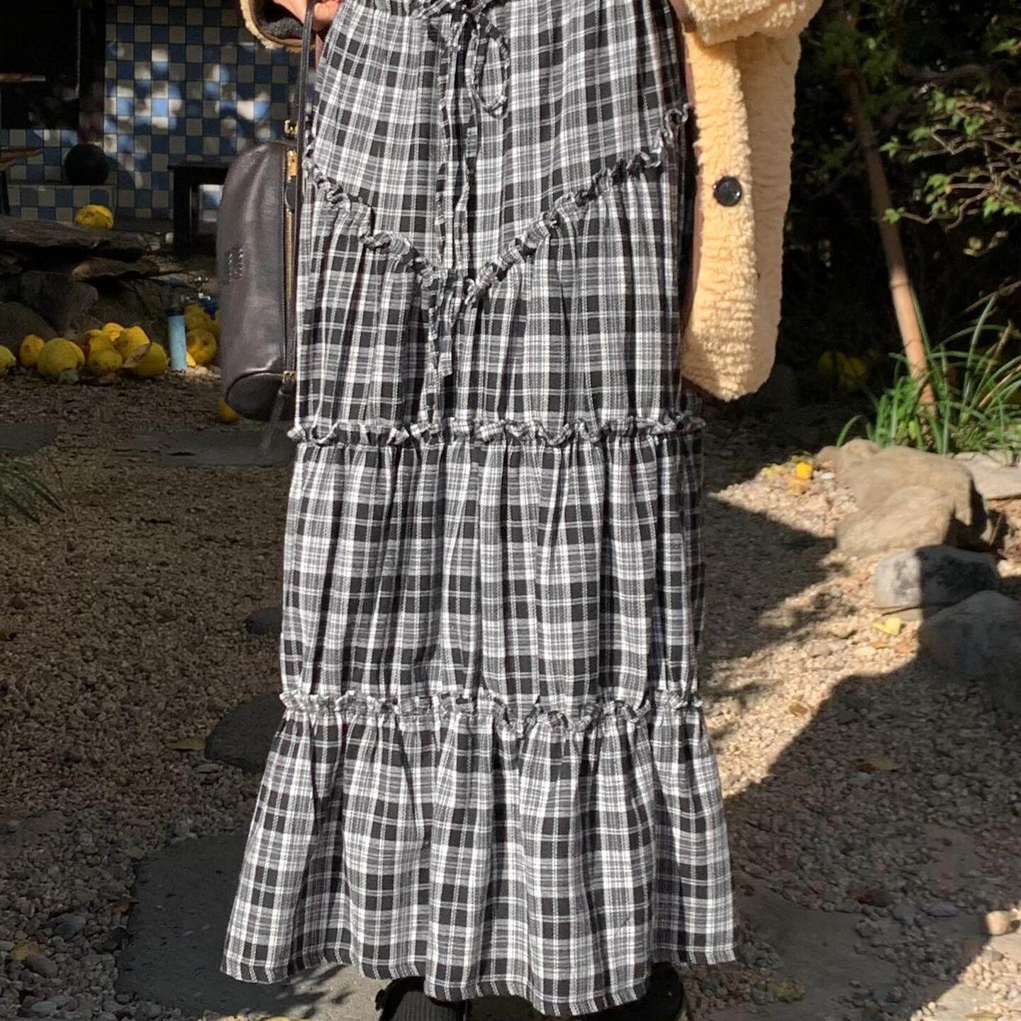 📚 Exclusive type韩国小众复古格纹褶皱拼接花边高腰抽绳半身裙长裙
