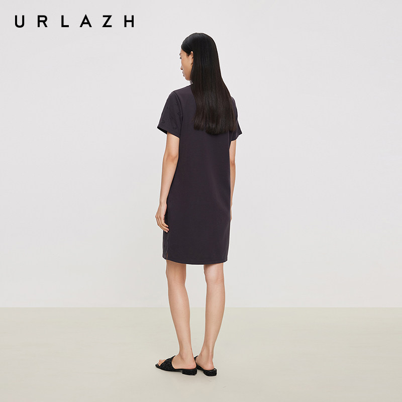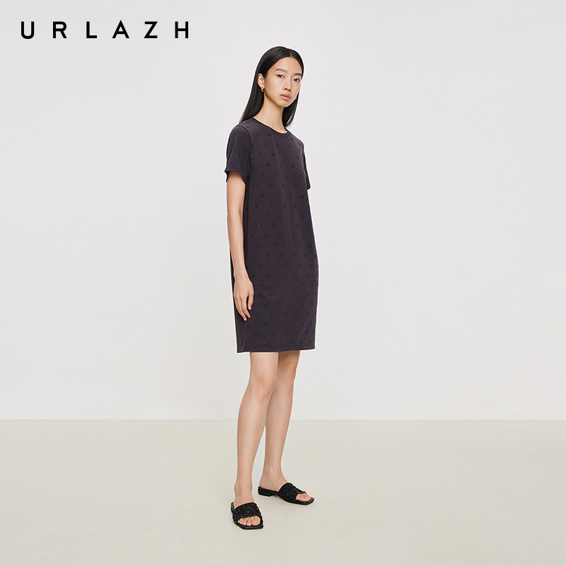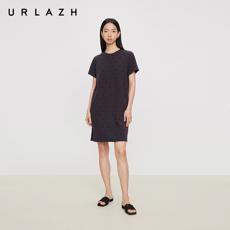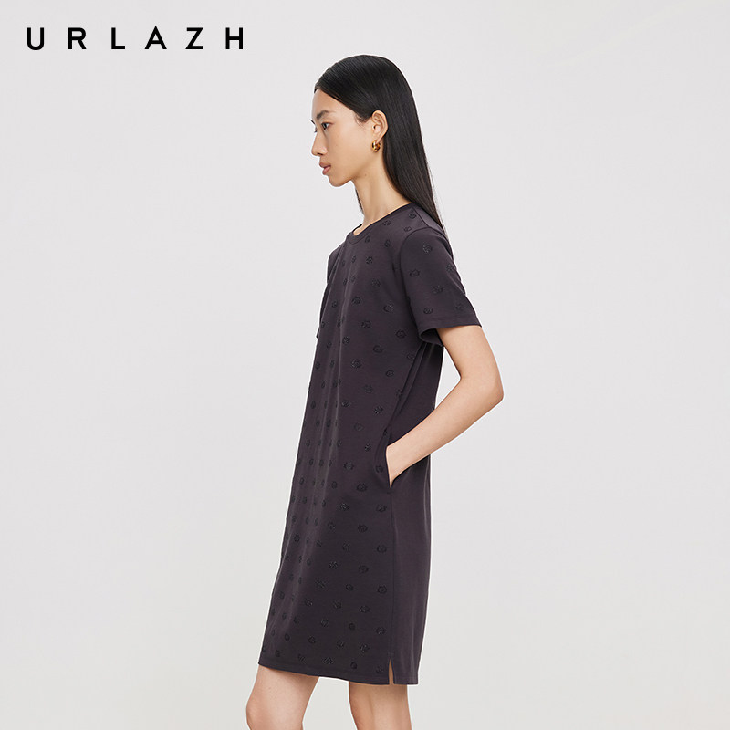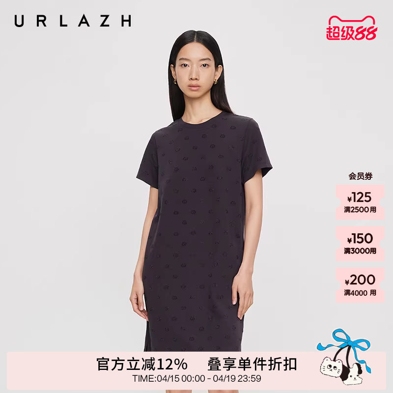 📚 URLAZH有兰夏季新款都市摩登碳灰圆领U等等猫咪烫钻直筒连衣裙女