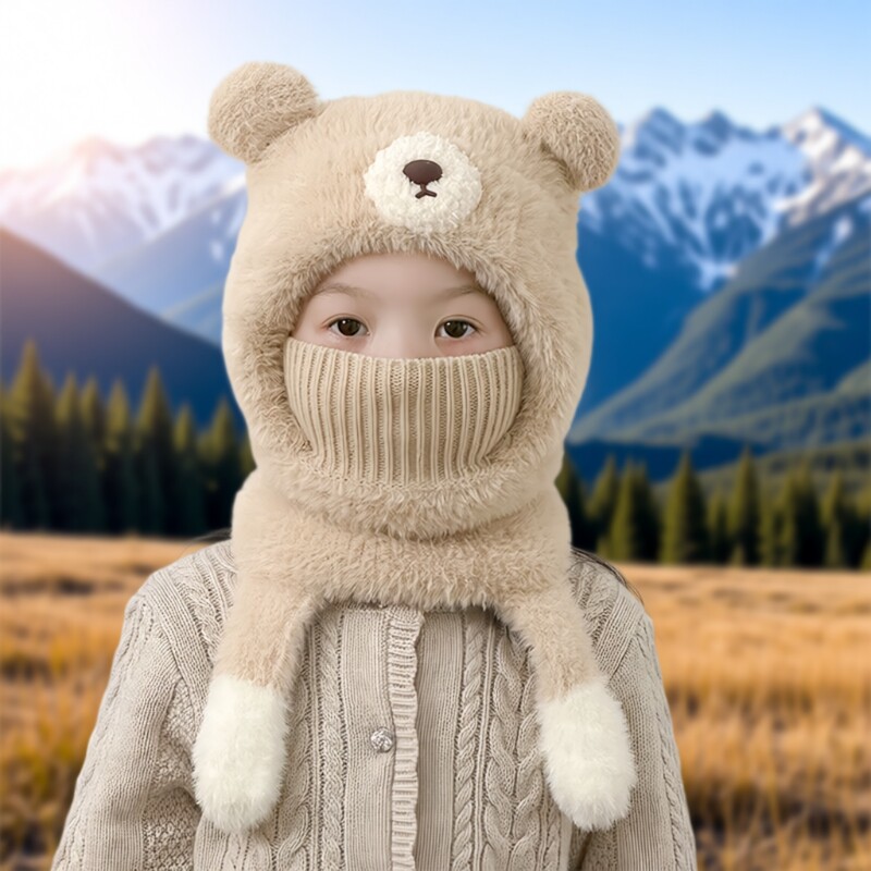 📚 儿童帽子秋冬款可爱小熊男童围脖口罩一体毛绒保暖女宝套头护耳帽