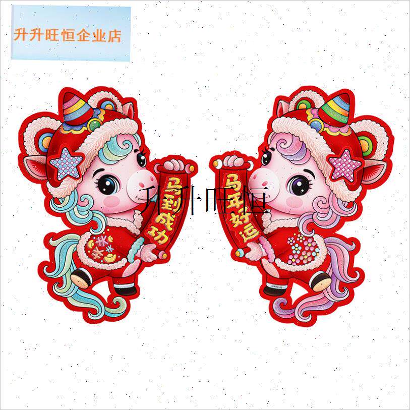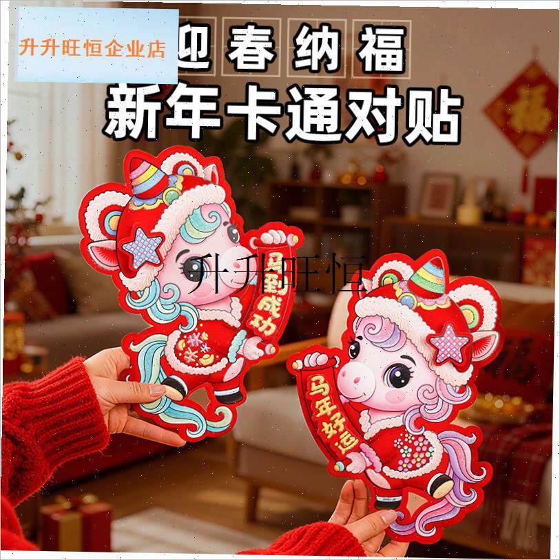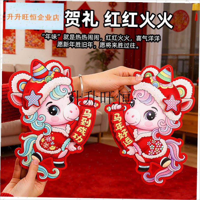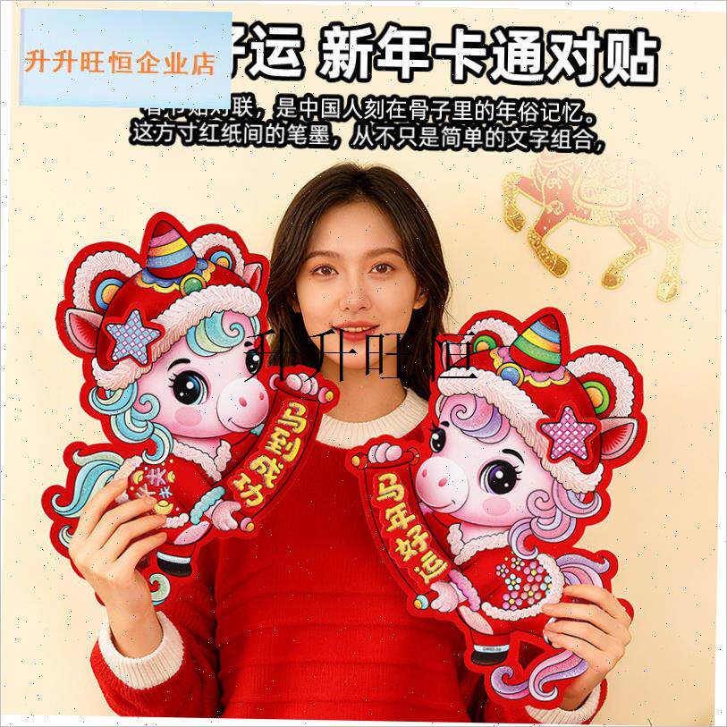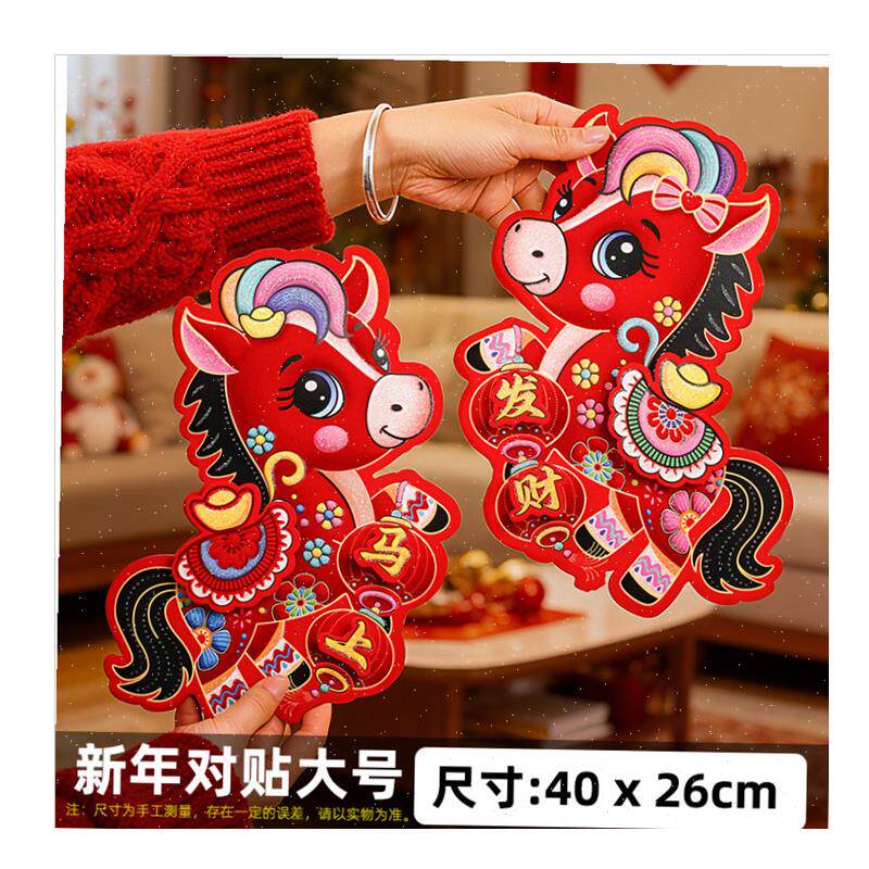 📚 026马年生肖卡纸对联植绒春联春节入户大门装饰过Z年立体对贴,