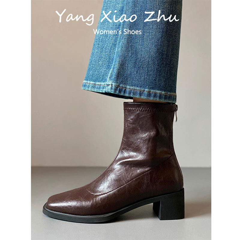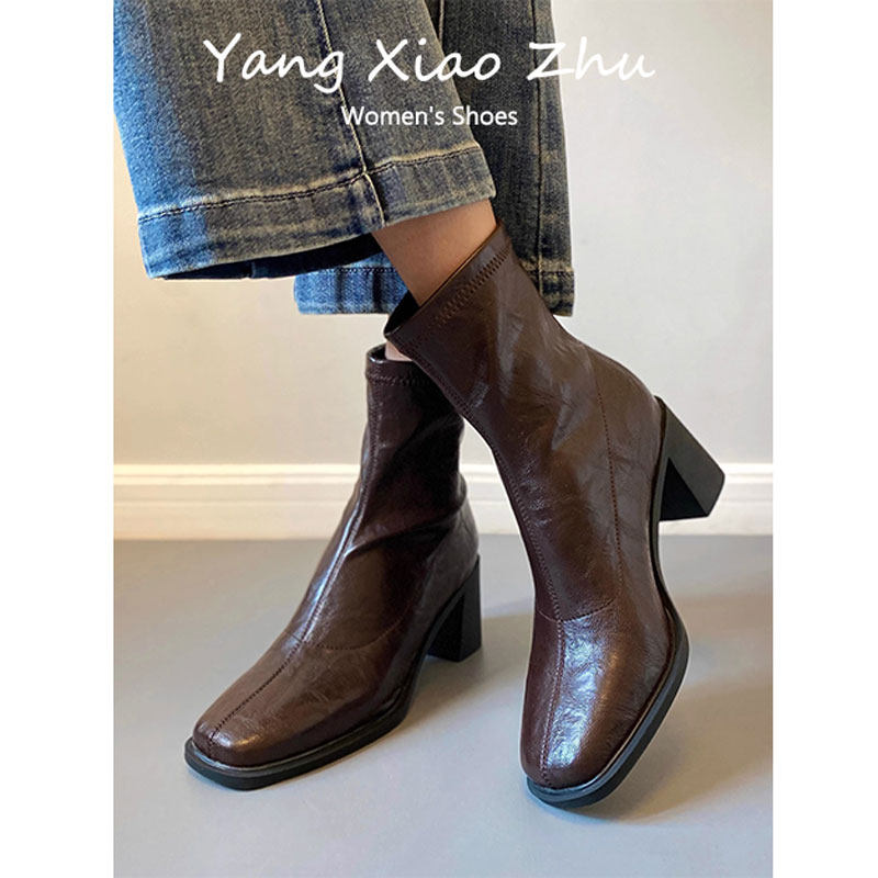 📚 牛皮版~高跟短靴女2025秋冬新款方头马丁靴小个子法式粗跟瘦瘦靴