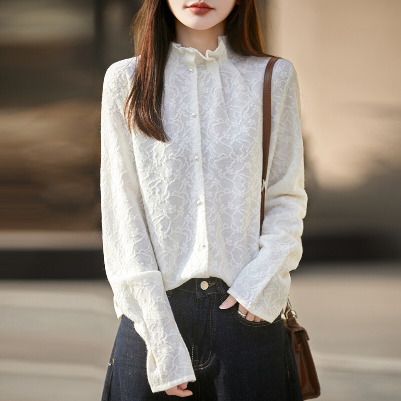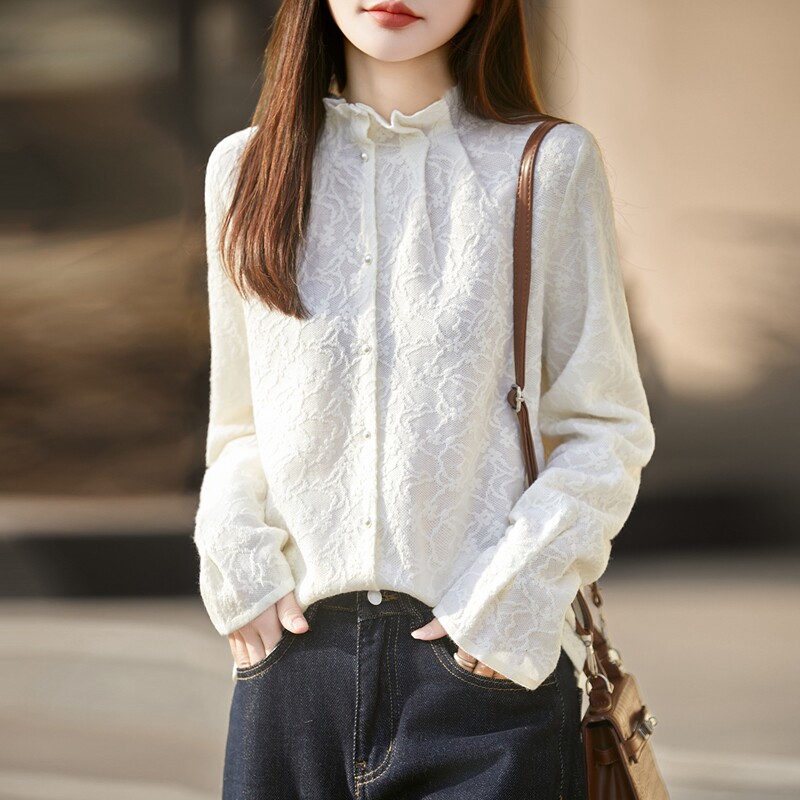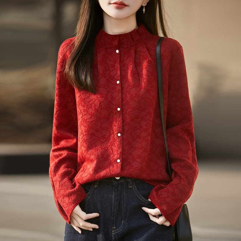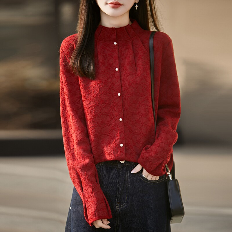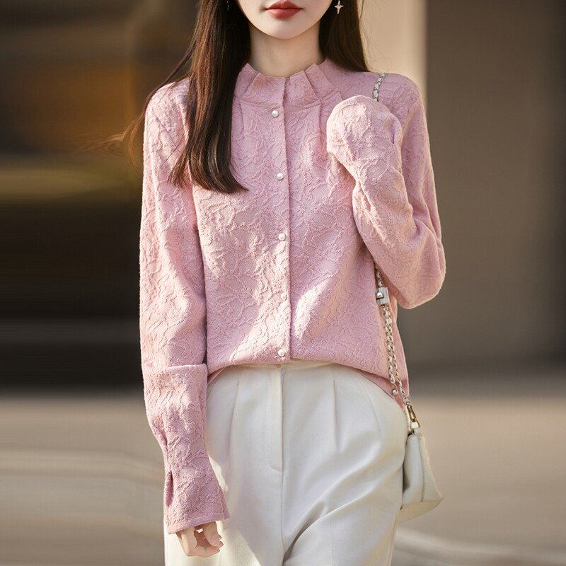 📚 秋冬精纺羊毛开衫女木耳边半高领立体浮雕提花毛衣宽松珍珠扣外套