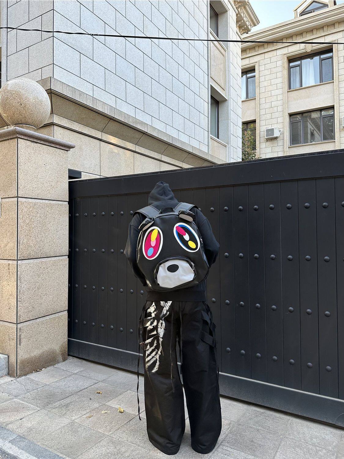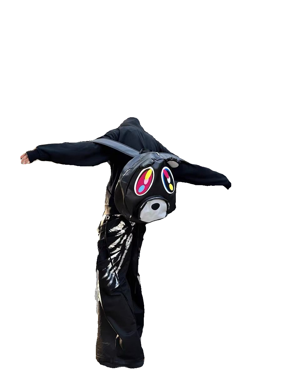 📚 网恋高手原创恶搞辍学熊黑PU皮双肩包大容量书包情侣款卡通背包