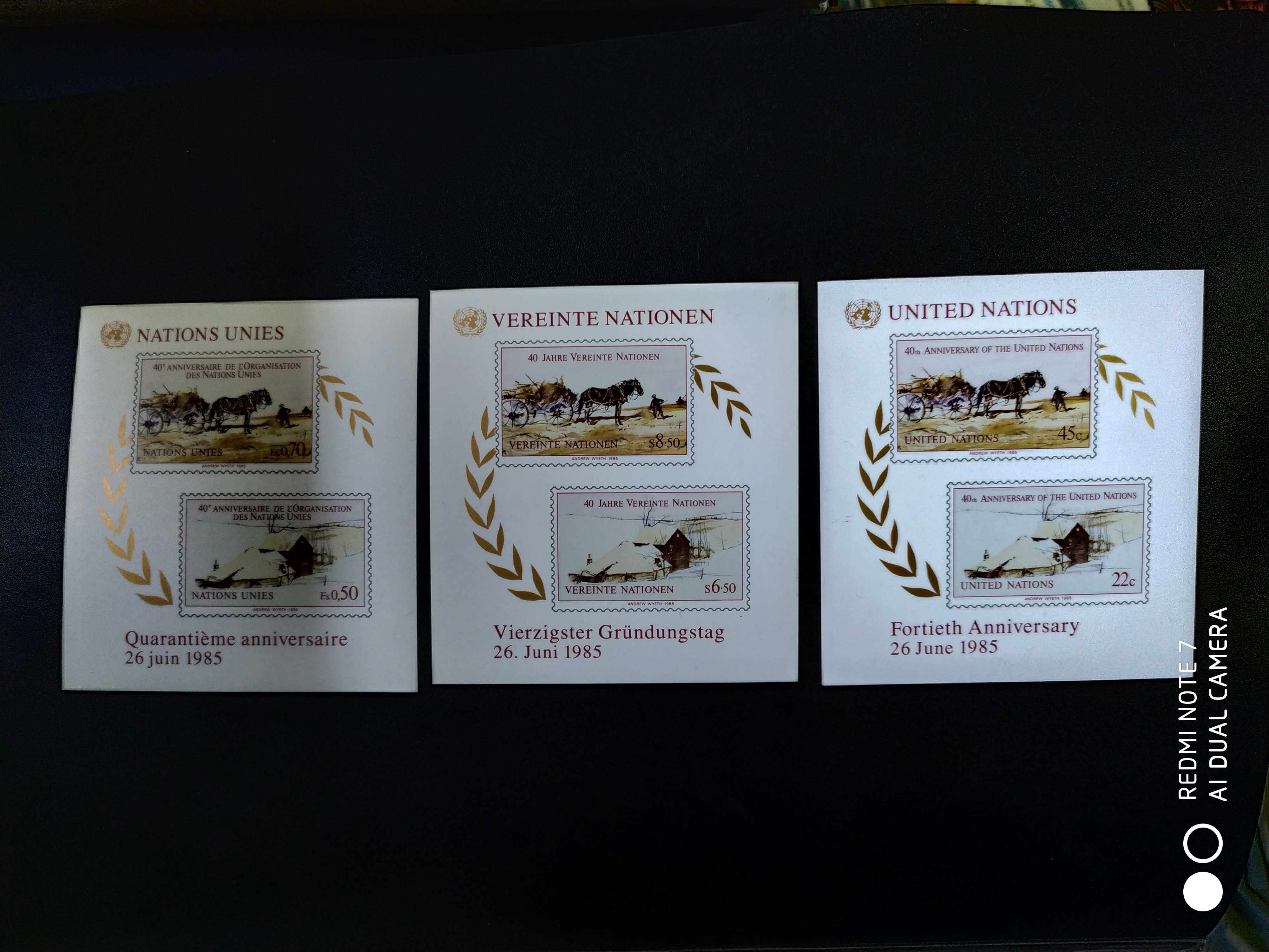 📚 联合国 1985年三地联发联合国40周年马 绘画 无齿小全张3全新