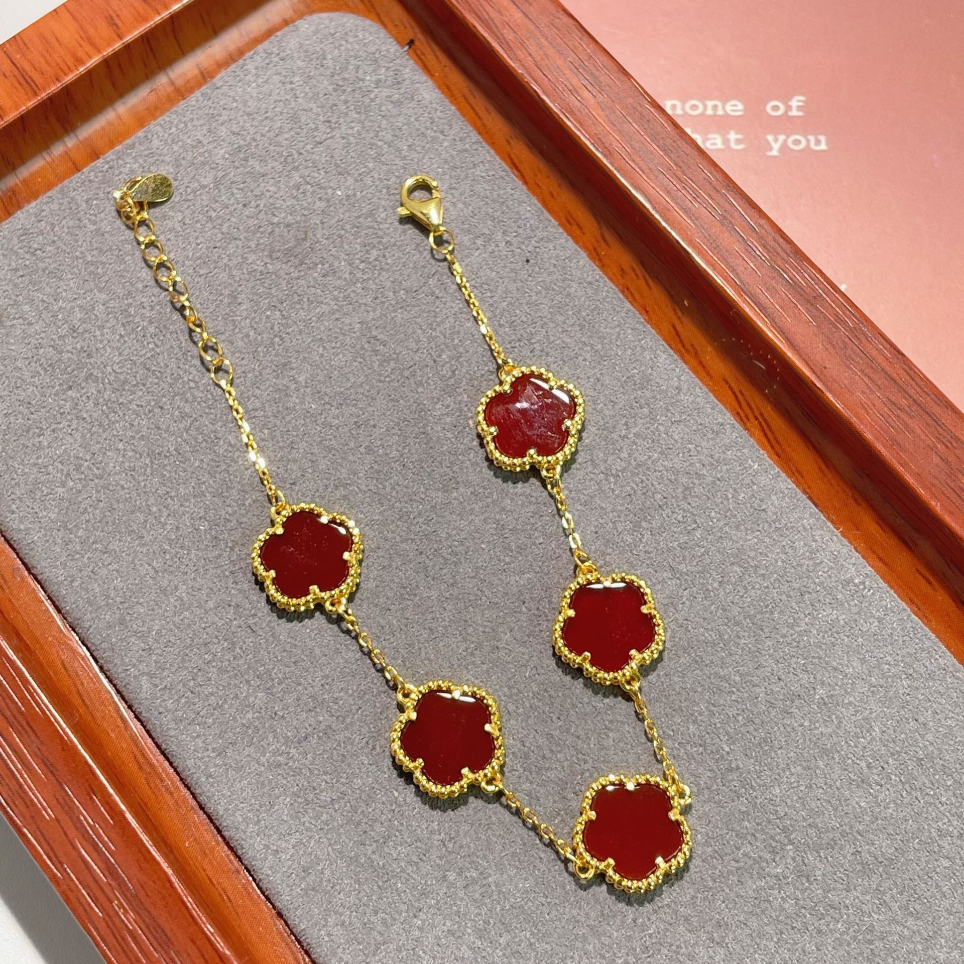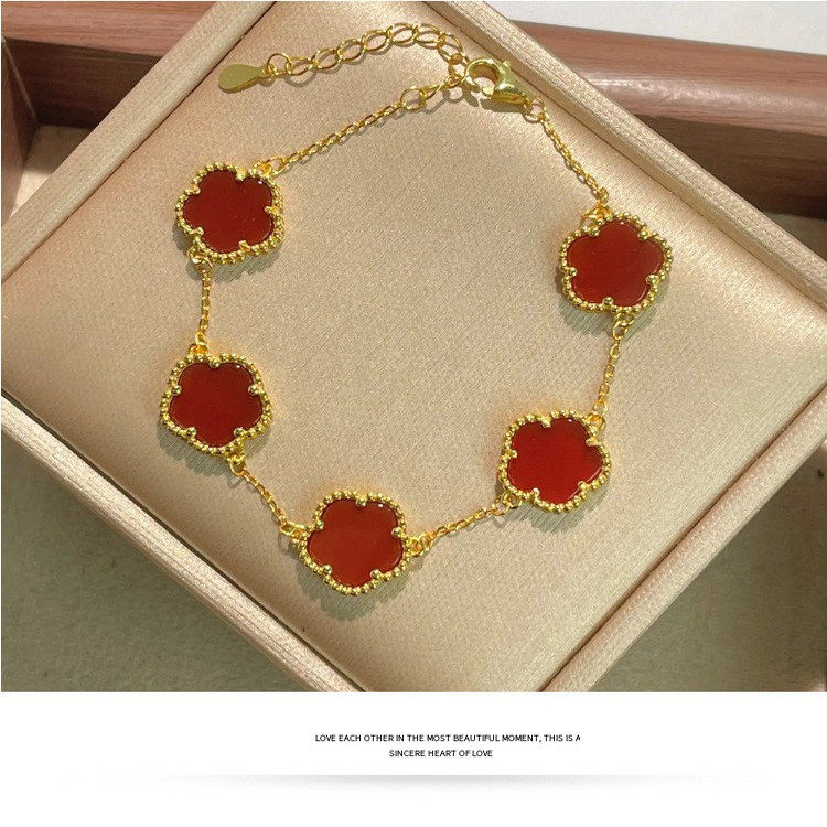 📚 s925纯银镀黄金色新款天然红玛瑙五花幸运四叶草手链女手串手饰品