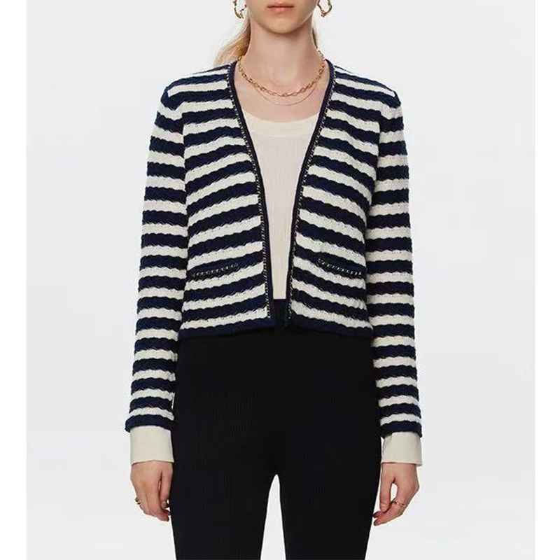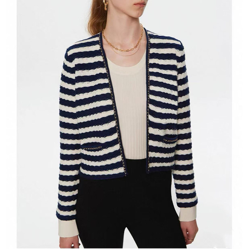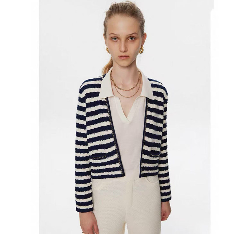 📚 春秋新款 纯棉链条小香风立体肌理感~绞花条纹针织开衫短小外套女