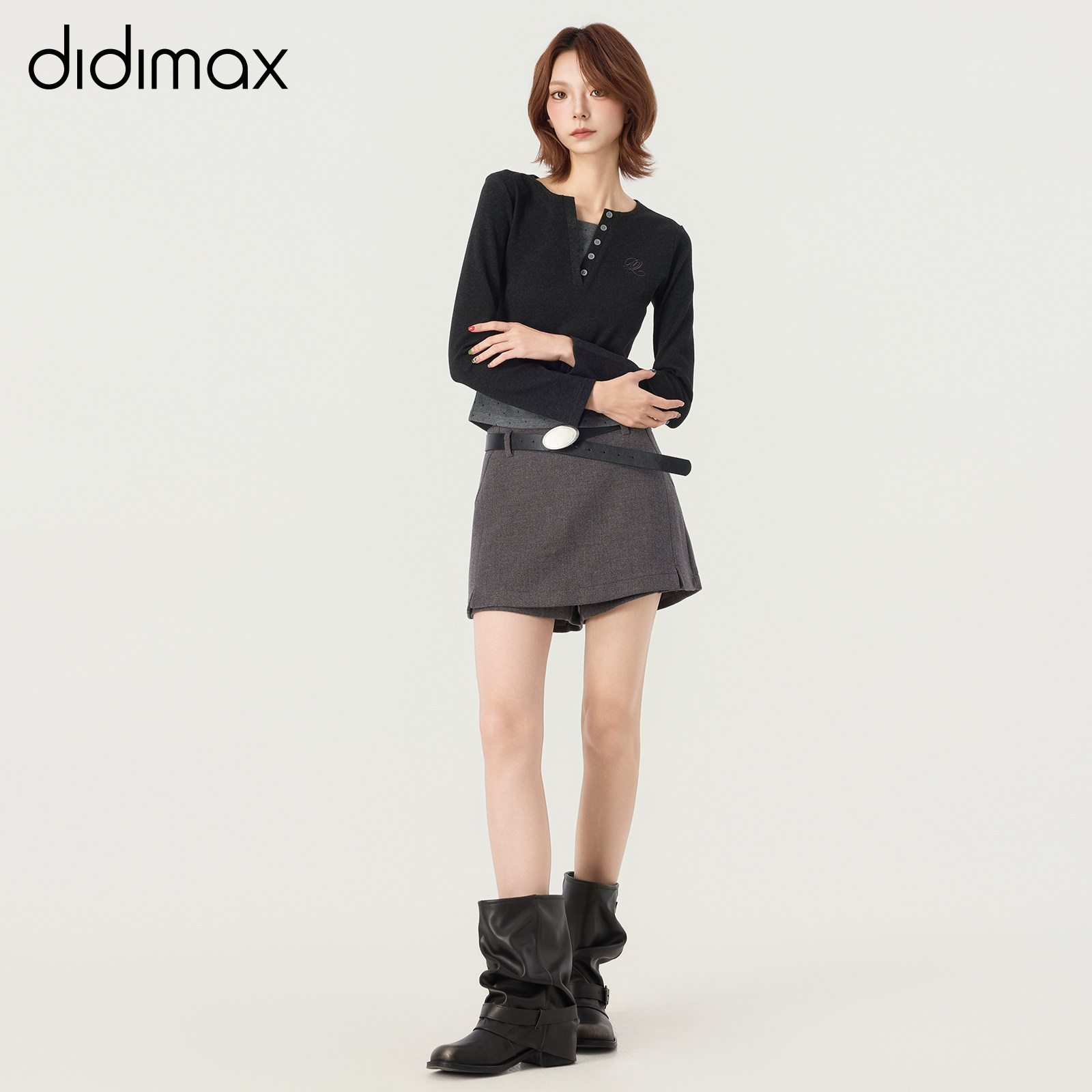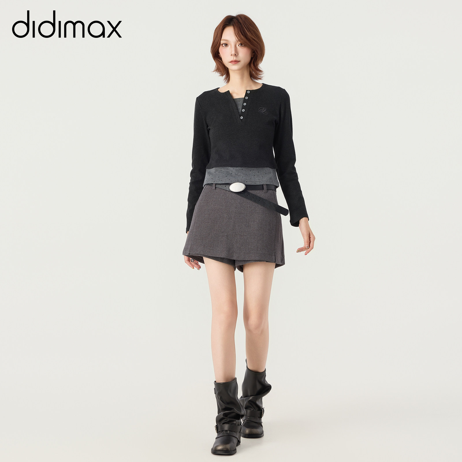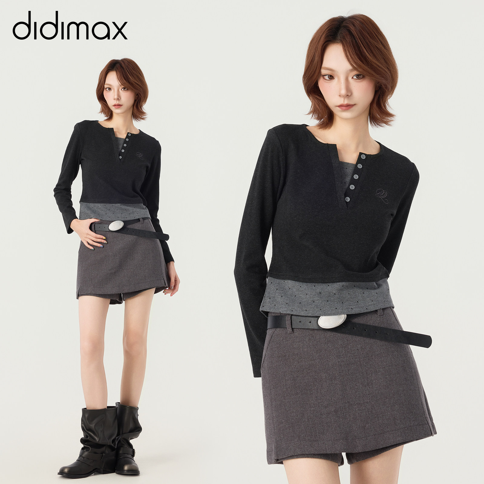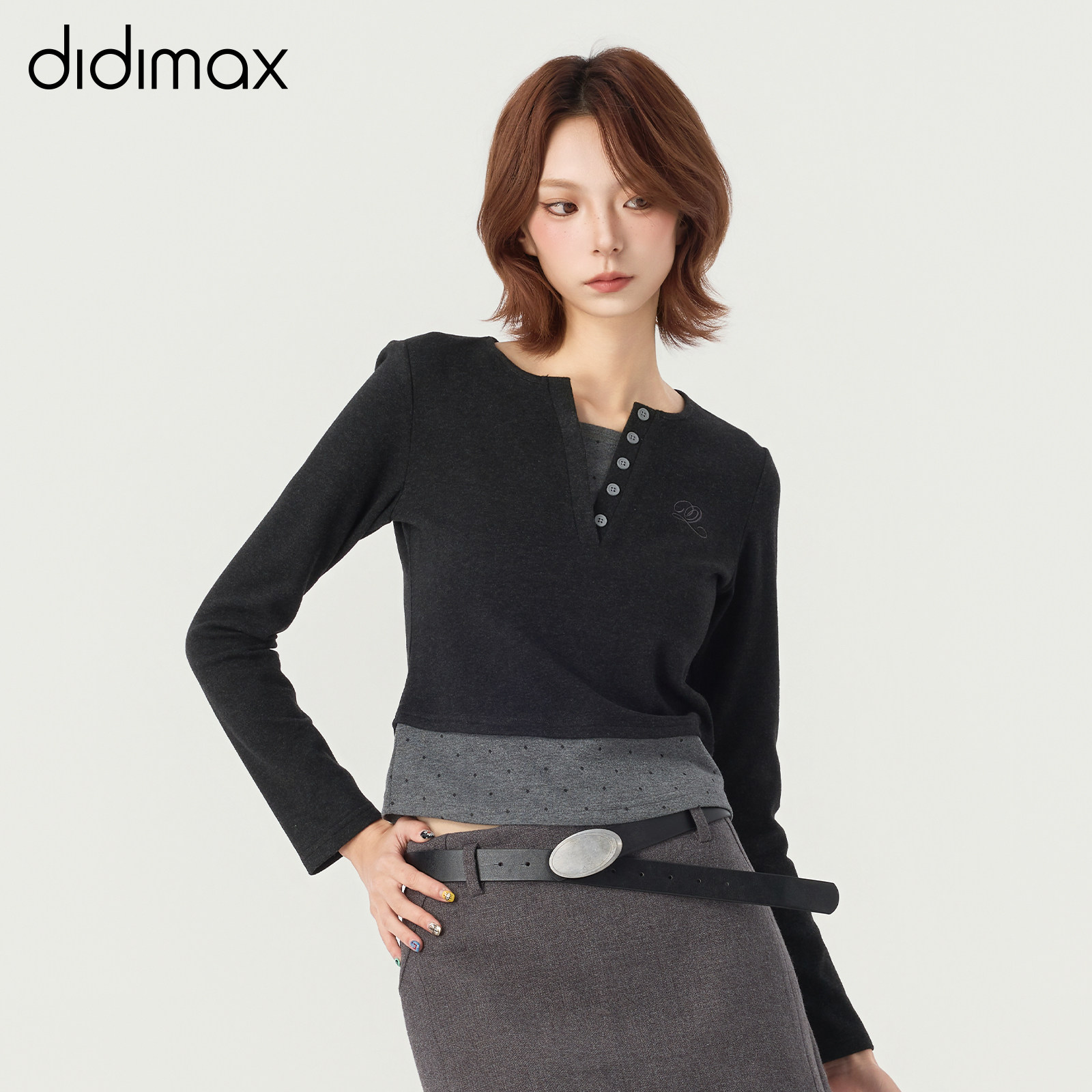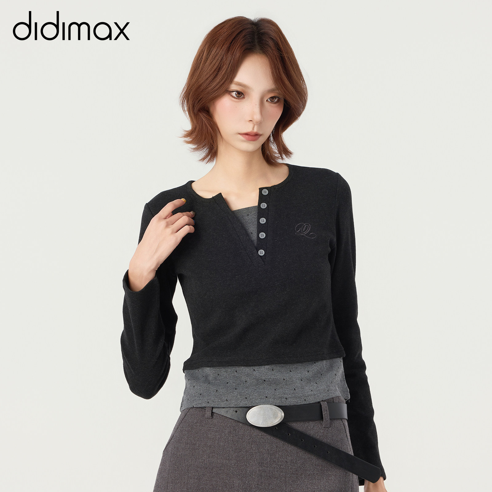 📚 didimax冬季新款灰色拼接V领正肩小衫 波点上衣内搭女原创W46076