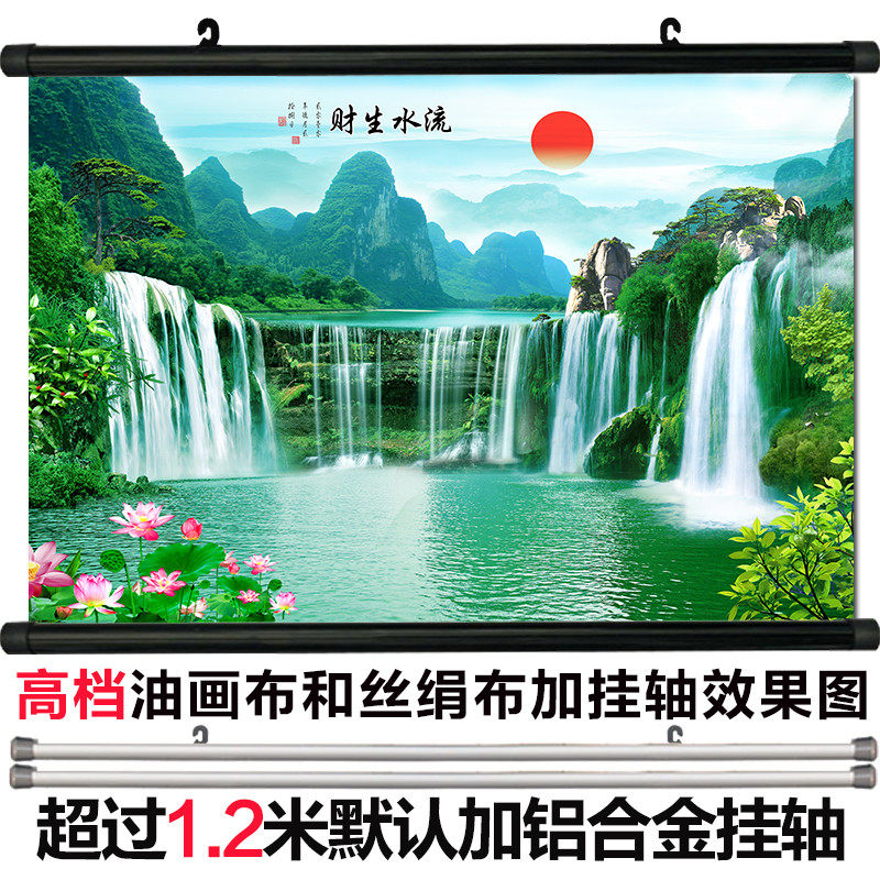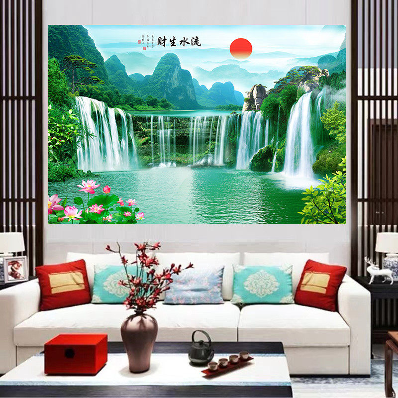 📚 黄果树瀑布流水生财客厅装饰画青山绿水招财风水画旭日东升自粘画