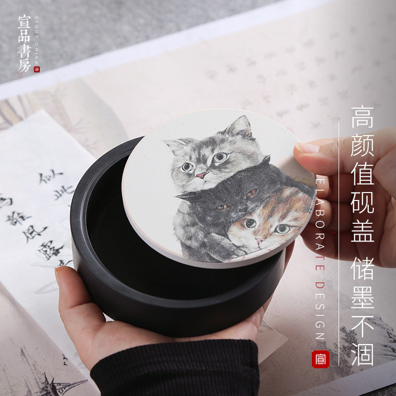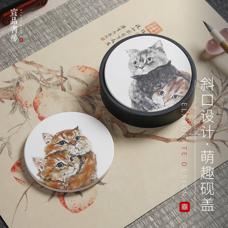 📚 宣品书房砚台带盖天然歙砚端砚兔子猫咪萌宠陶瓷砚盖斜口墨海密封墨池研墨初学写毛笔字砚文房四宝书法用品