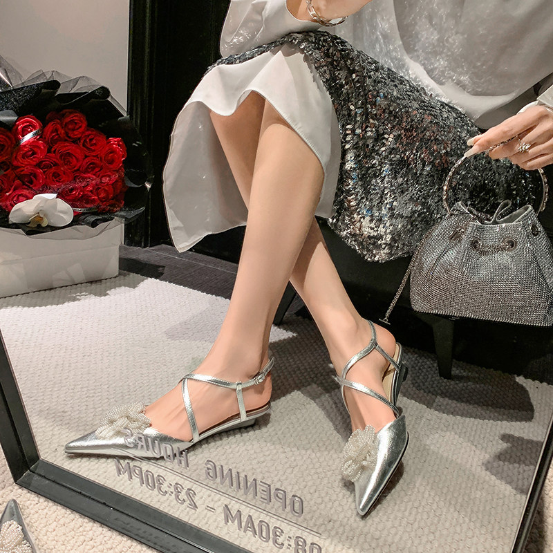 📚 交叉绑带玛丽珍凉鞋女绝美手工珍珠尖头单鞋坡低跟超软包头凉拖鞋