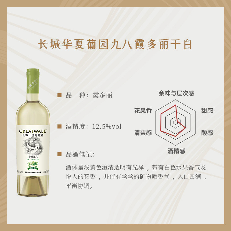 📚 华夏葡园经典九八霞多丽纪念干白葡萄酒6瓶「长城酒官方旗舰店」