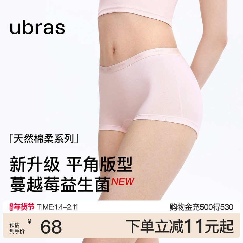 📚 ubras平角纯棉内裤女15A抗菌加长裆字母织带包臀四角女士大码短裤