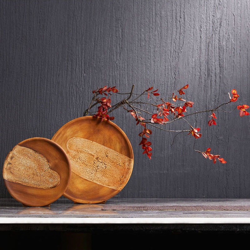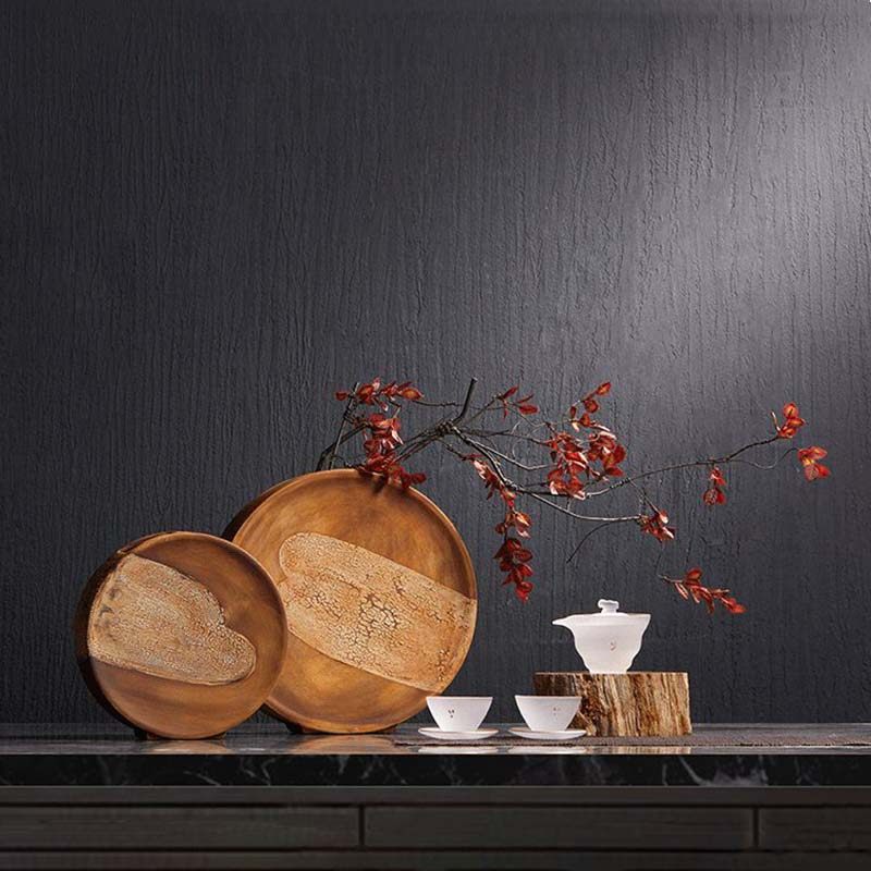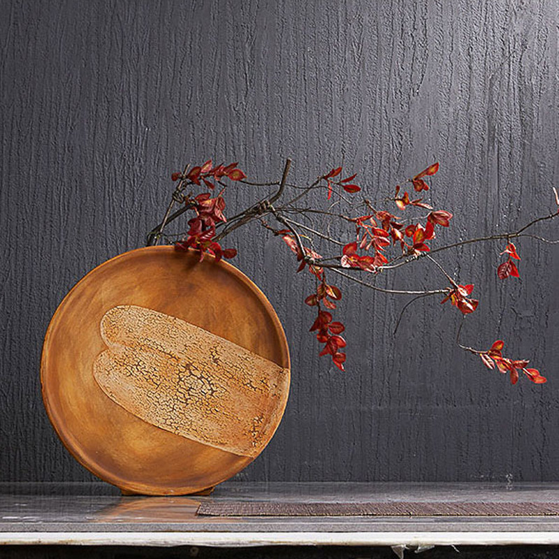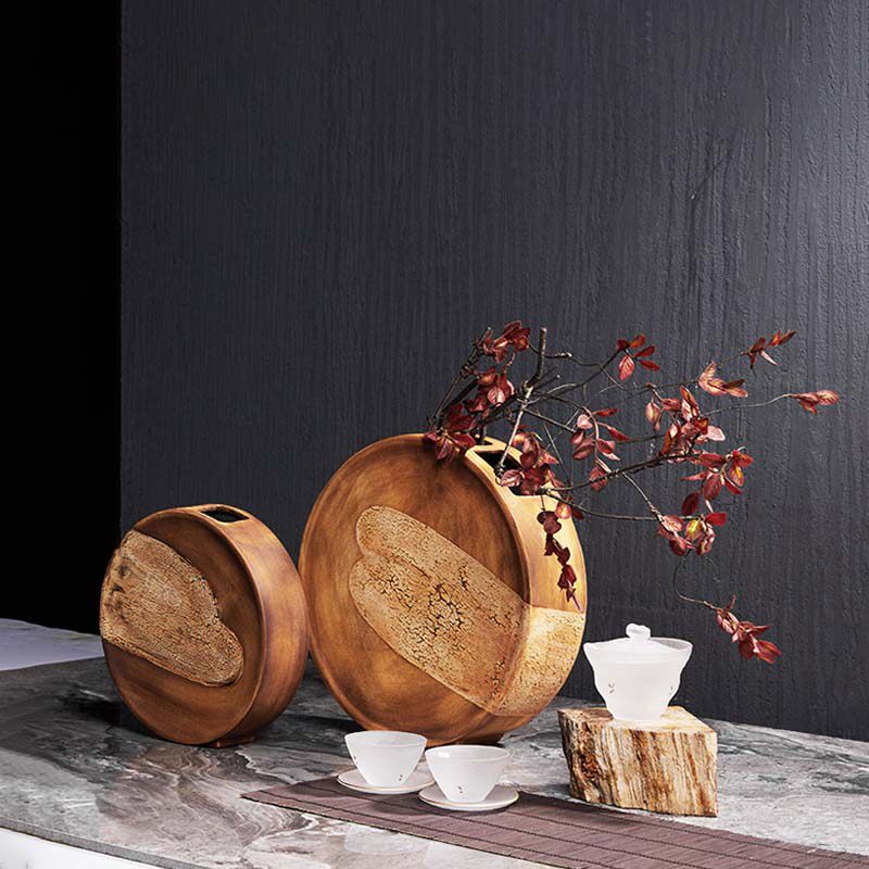 📚 现代新中式侘寂风陶瓷木纹扁圆花瓶摆件样板间民宿酒店花器装饰品