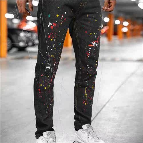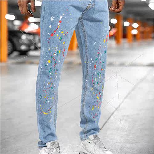 📚 Men jeans 2021 spring new casual printing washed old holes S
