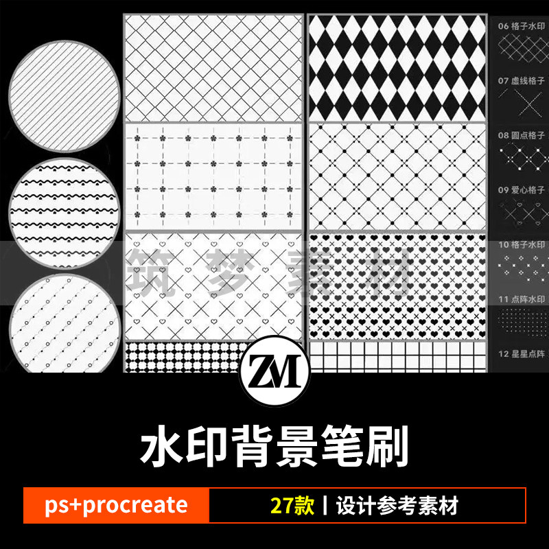 📚 ps笔刷procreate笔刷水印背景爱心格子格纹圆点菱形斜线底纹素材