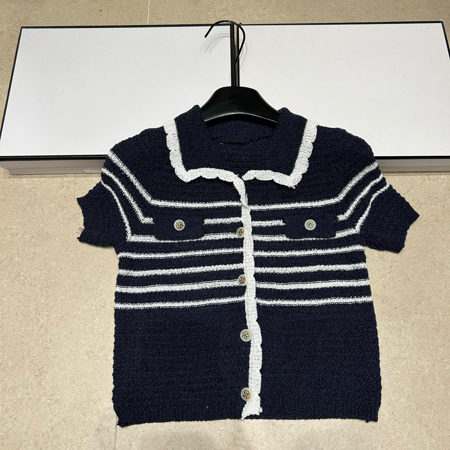 📚 Trendy Bazaar 春夏条纹撞色针织开衫女短袖翻领纽扣百搭减龄上衣