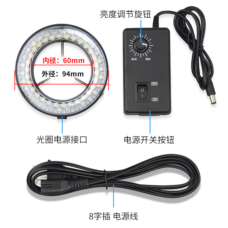 📚 高品电子显微镜可调光源亮度LED环形灯圈工业体视单筒螺牙接口聚光辅助补光设备视觉PCB检测黄光紫光蓝光D200