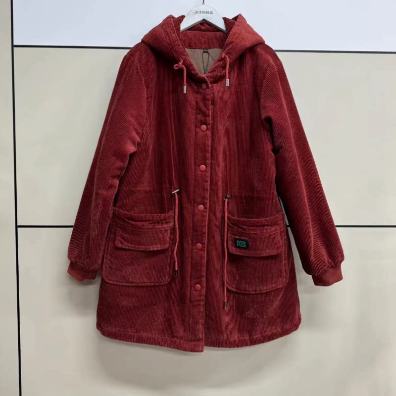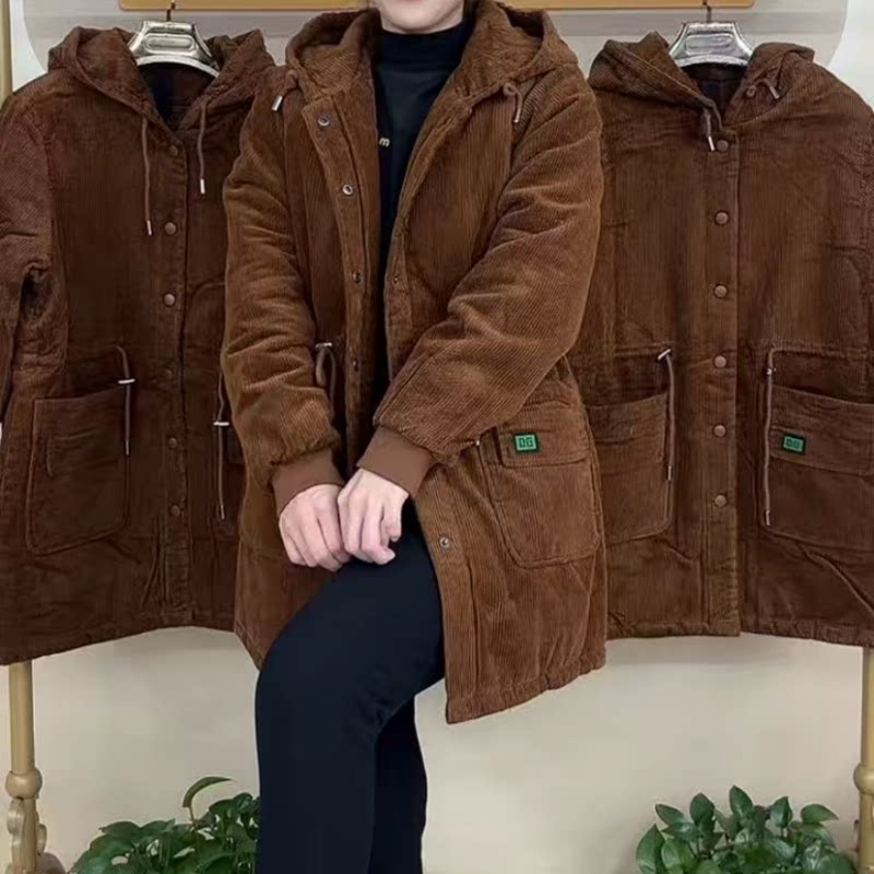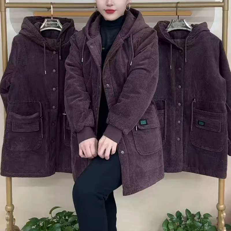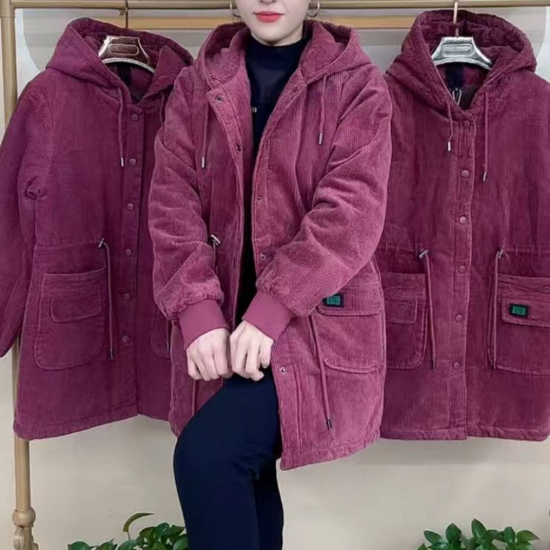 📚 高档气质连帽条绒净色抽绳保暖外套女时尚洋气保暖妈妈装加厚上衣
