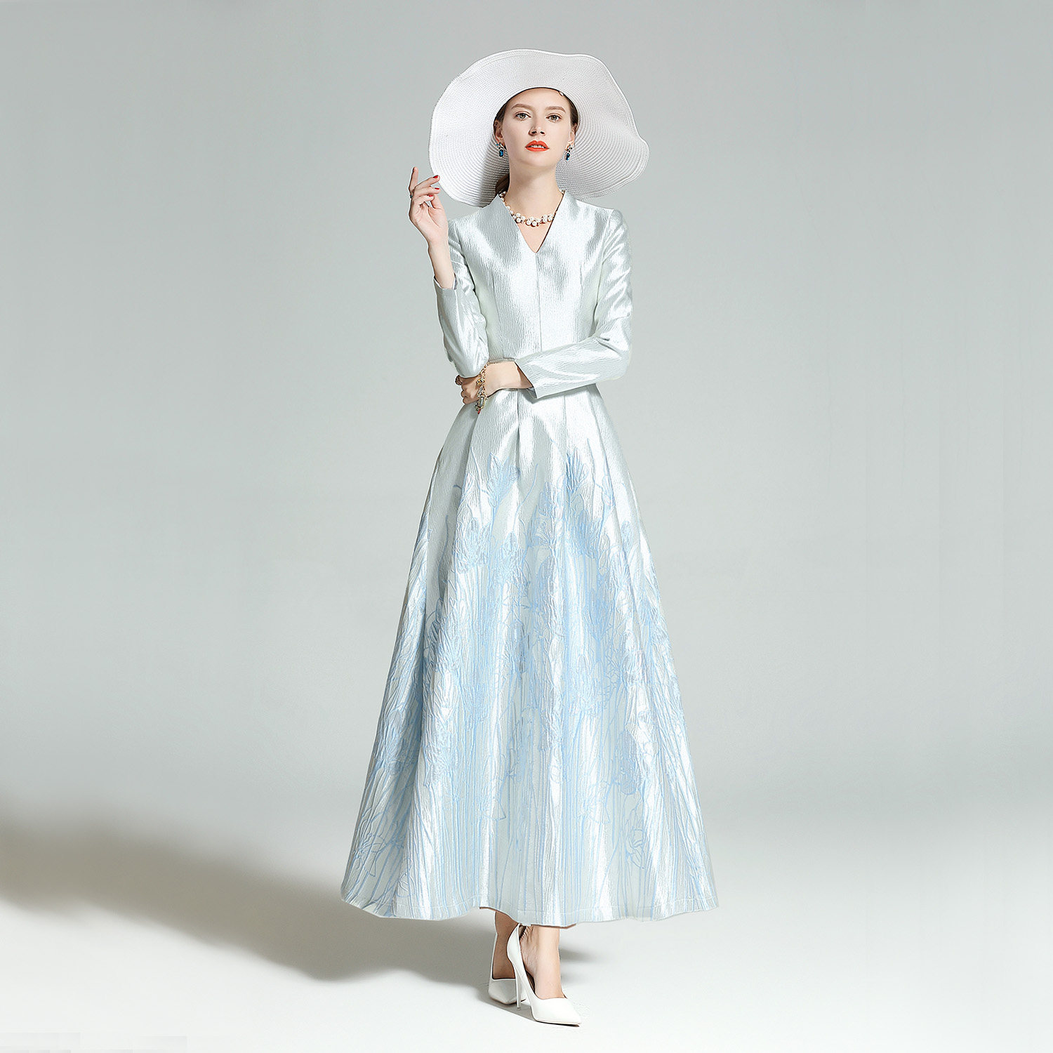📚 欧美高定原创银灰色缎面提花礼服长裙大码长袖V领大摆伞裙连衣裙