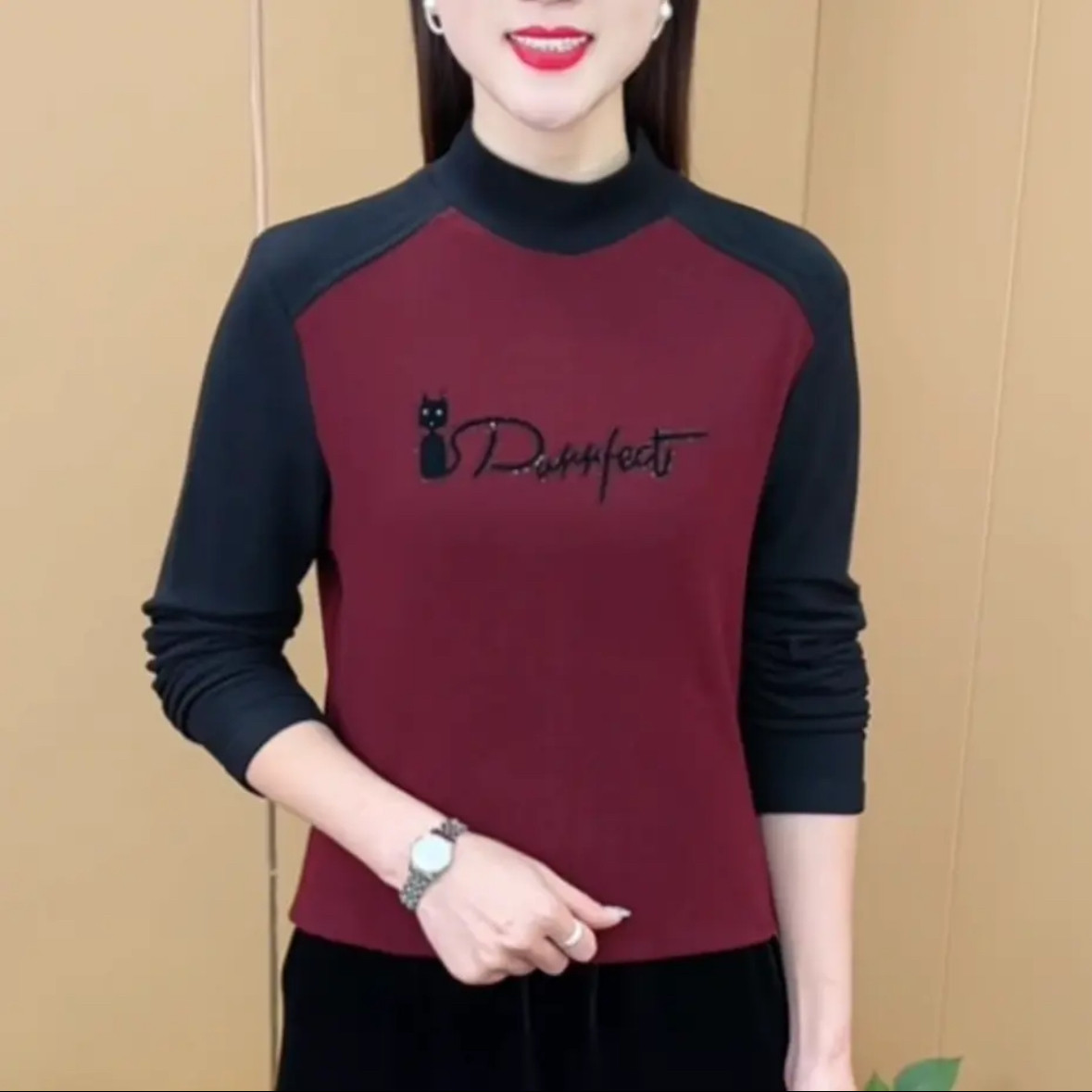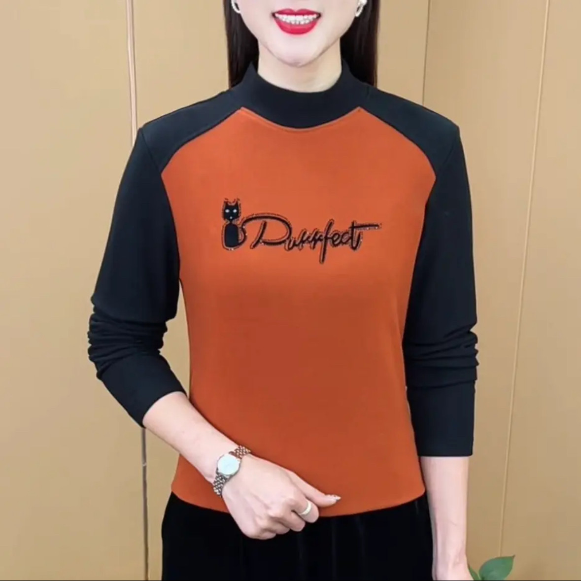 📚 撞色半高领德绒保暖打底衫女2026年秋冬季新款刺绣洋气妈妈装上衣