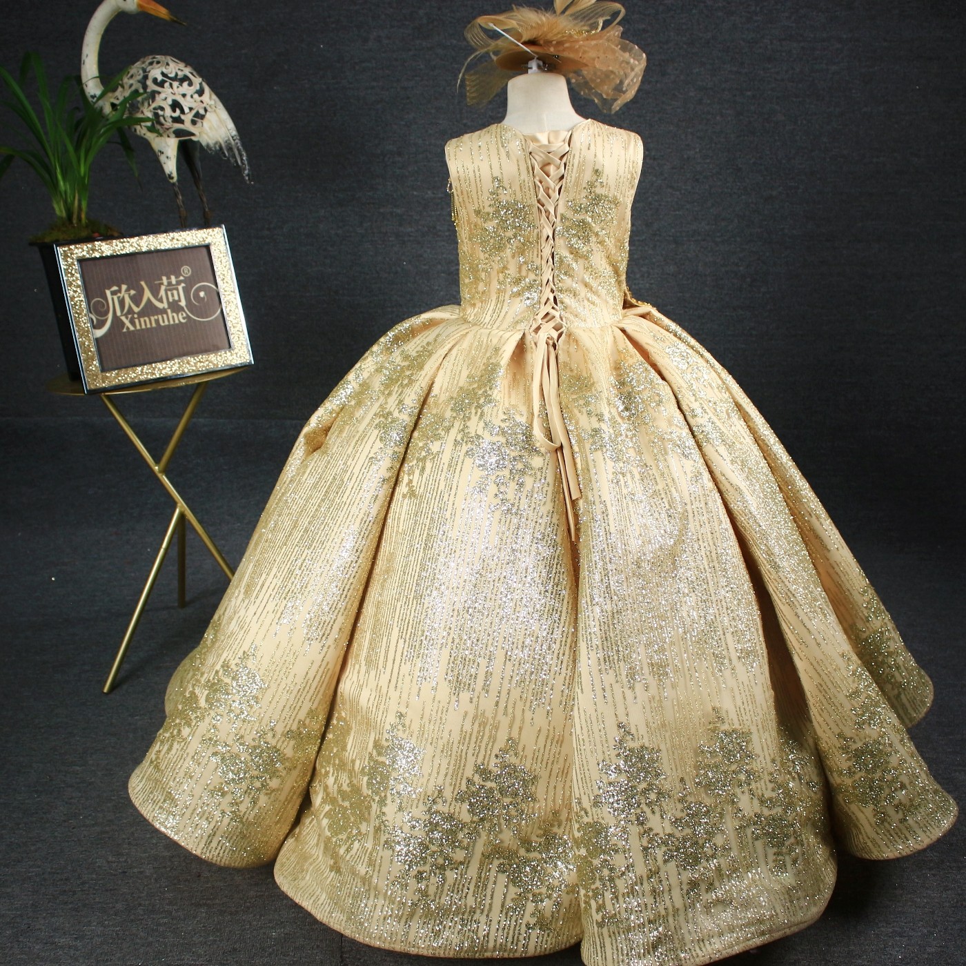 📚 欣入荷女童金色长款重工礼服华丽大气优雅主持走秀演出宴会晚礼服
