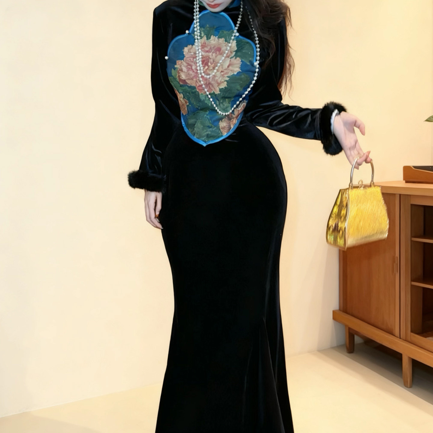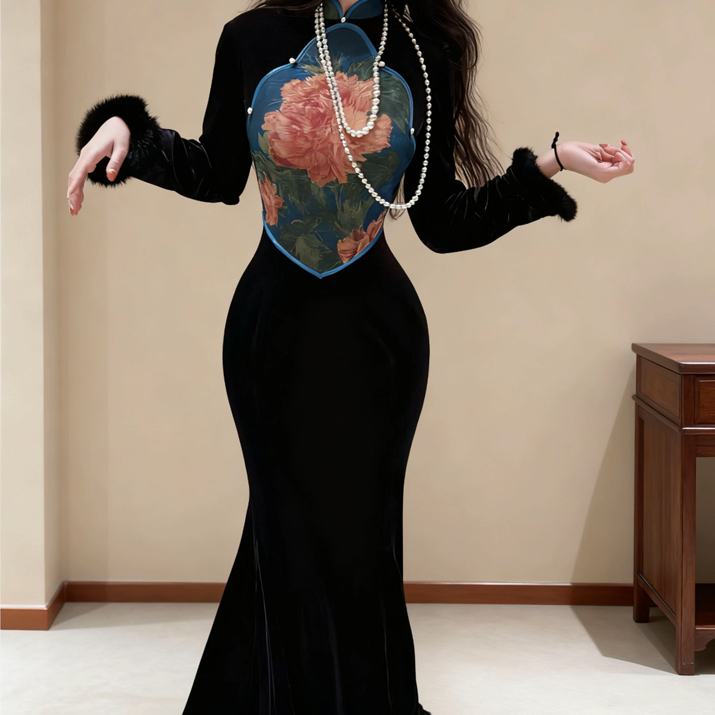 📚 秋冬复古改良黑色丝绒大裙摆旗袍新中式长袖包臀裙气质九尾狐之蓝