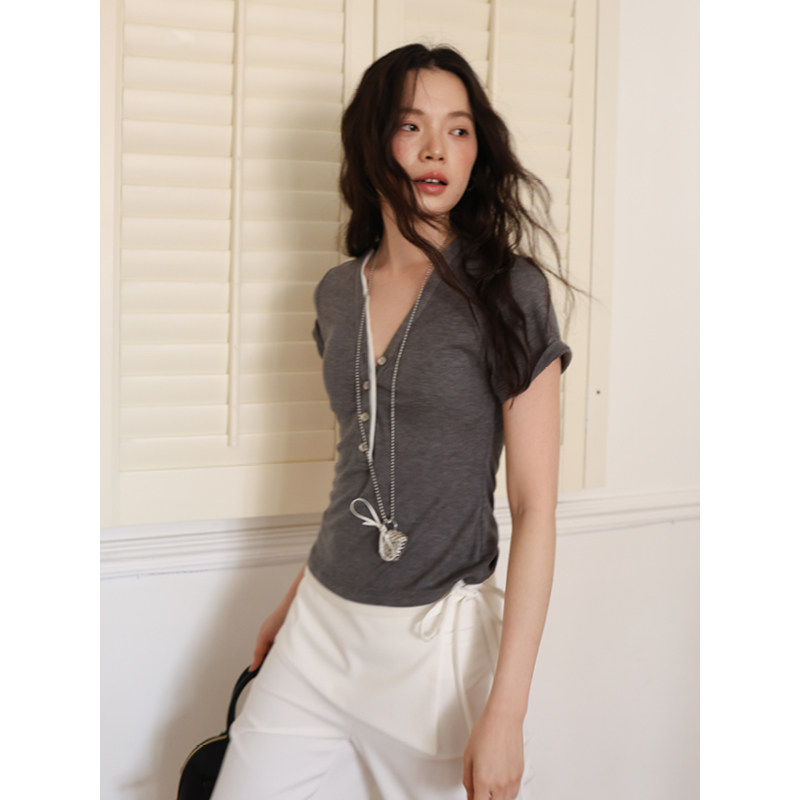 📚 SUPERSCAPE莱赛尔桑蚕丝柔软触感抗皱V领修身撞色短款T恤撞色