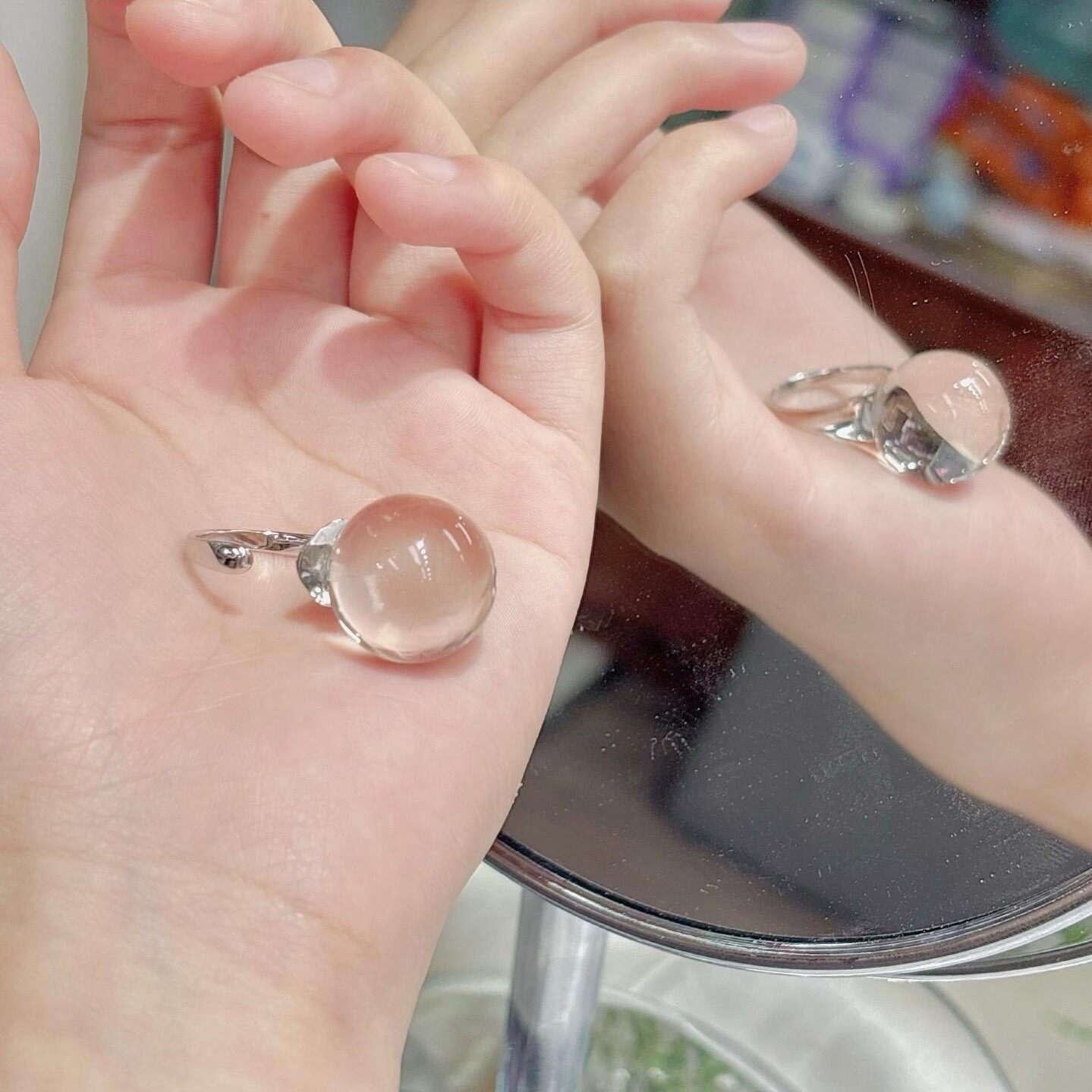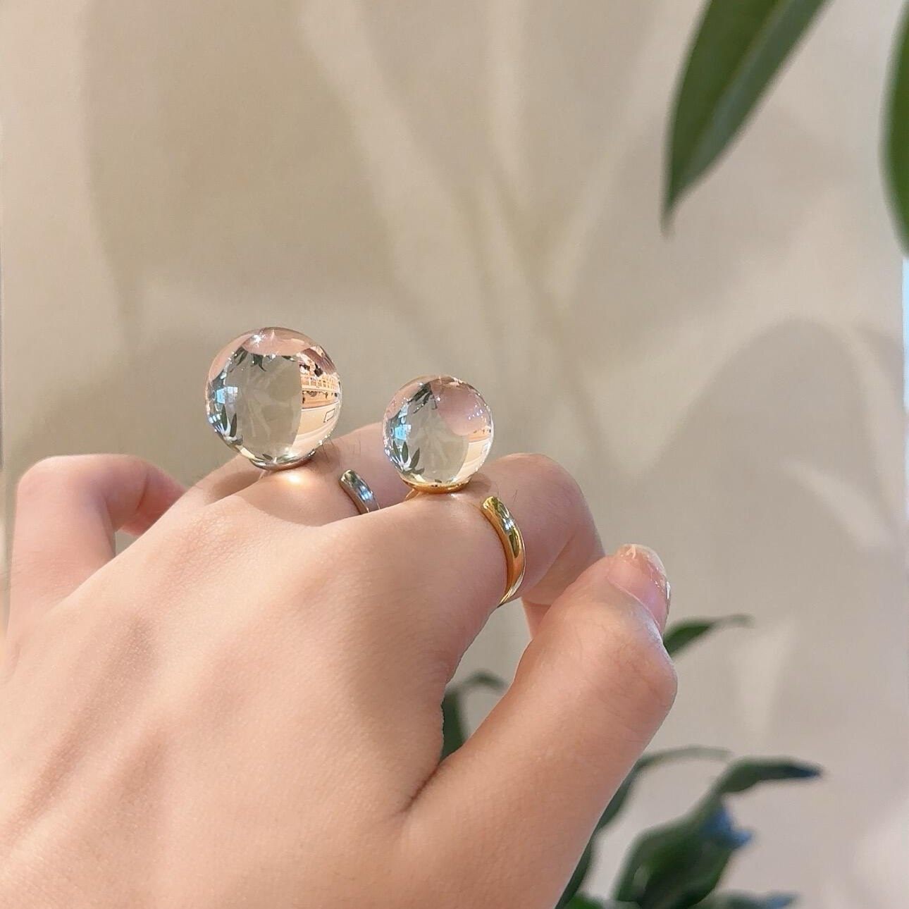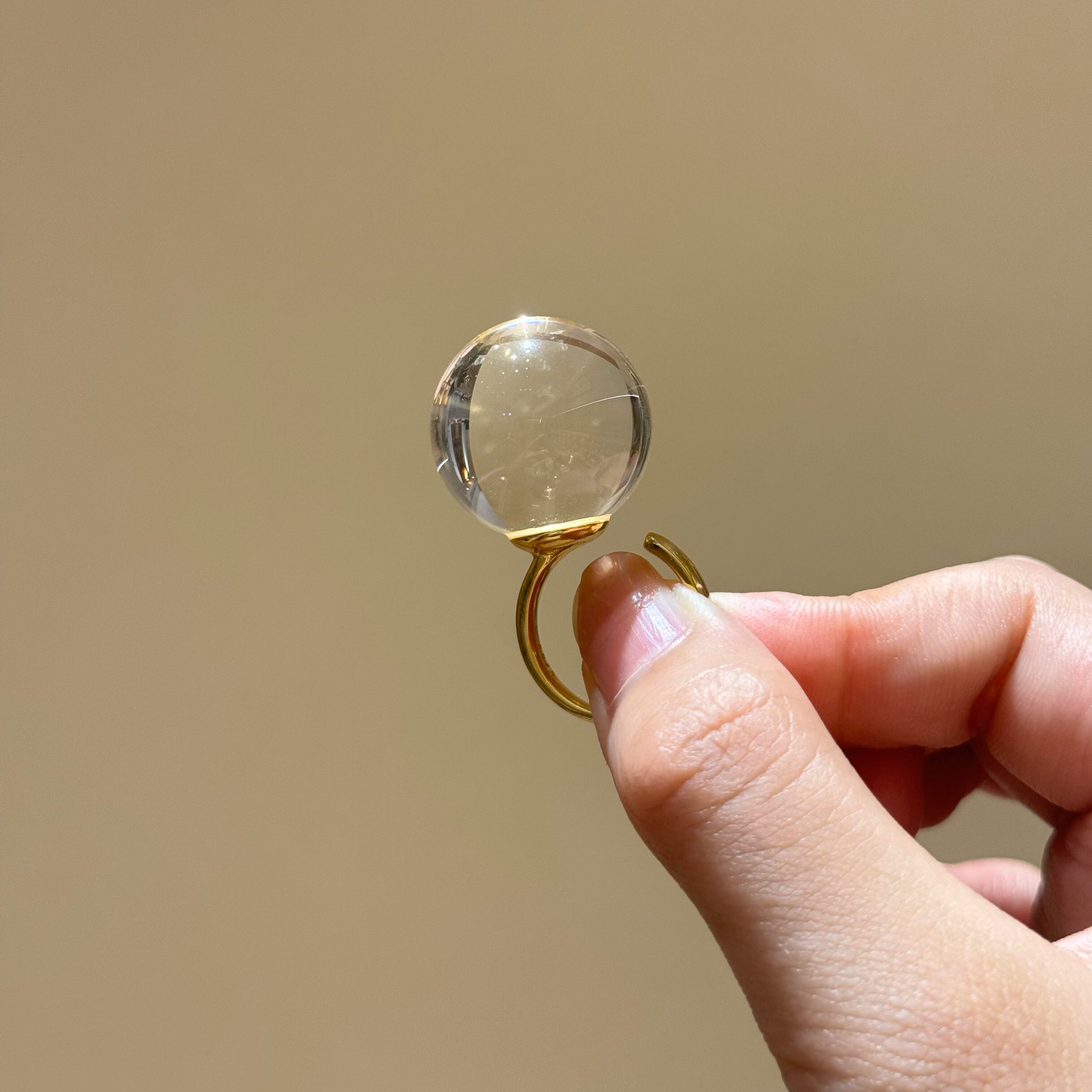📚 赵露思同款天然全净体白水晶圆珠戒指光面素圈大颗粒指环个性男女